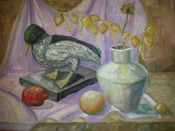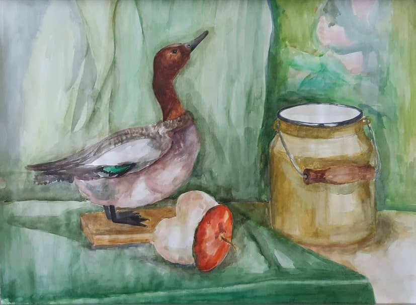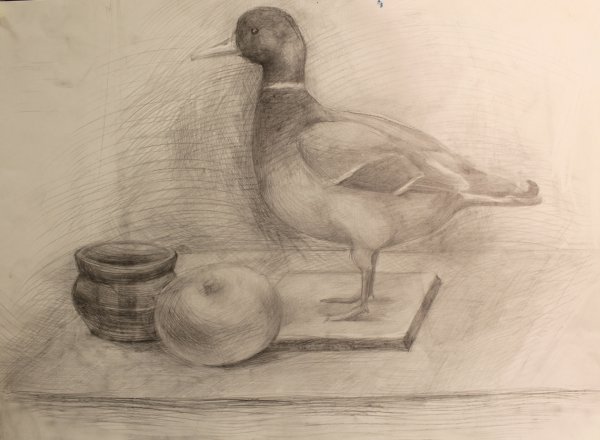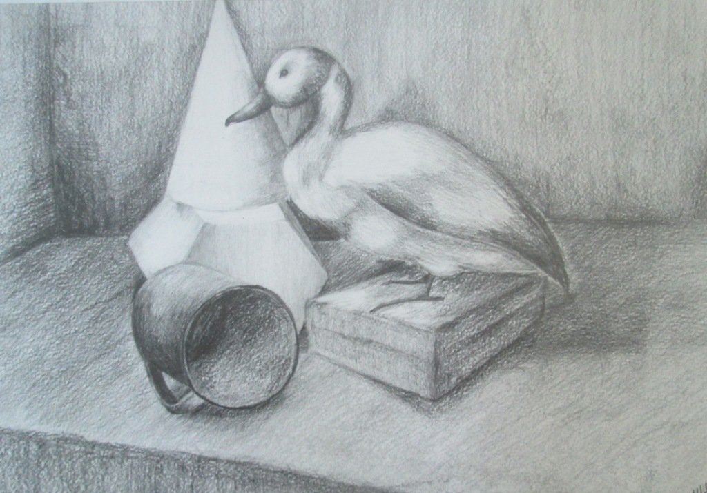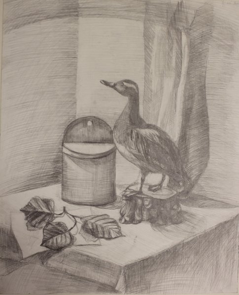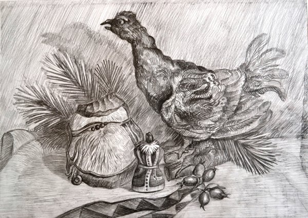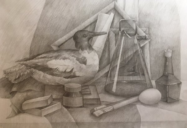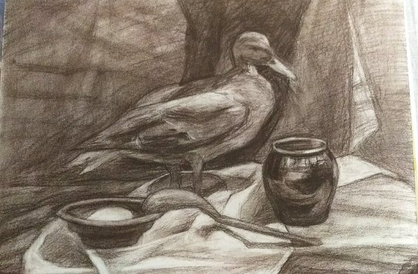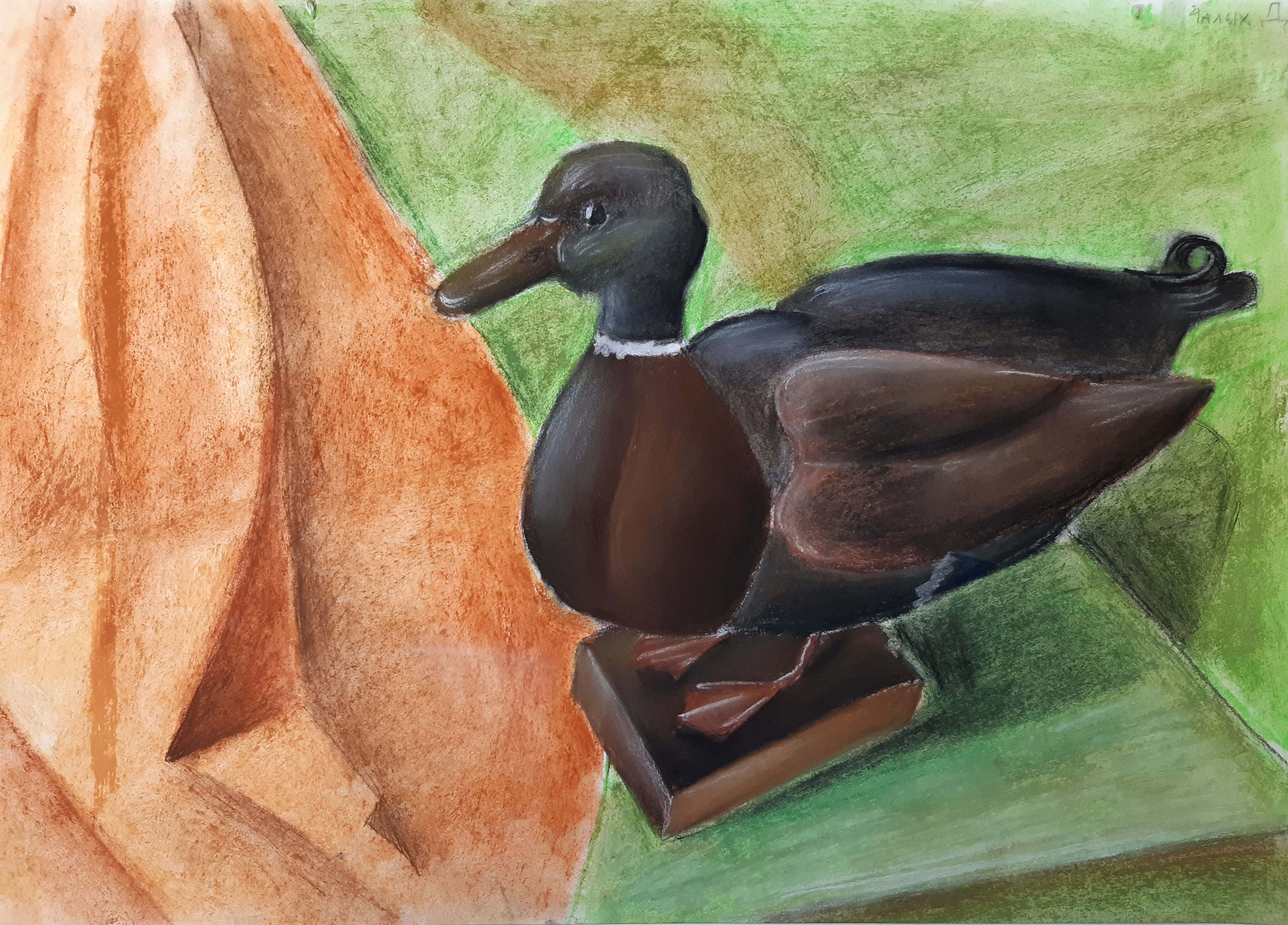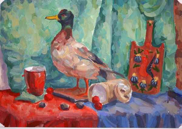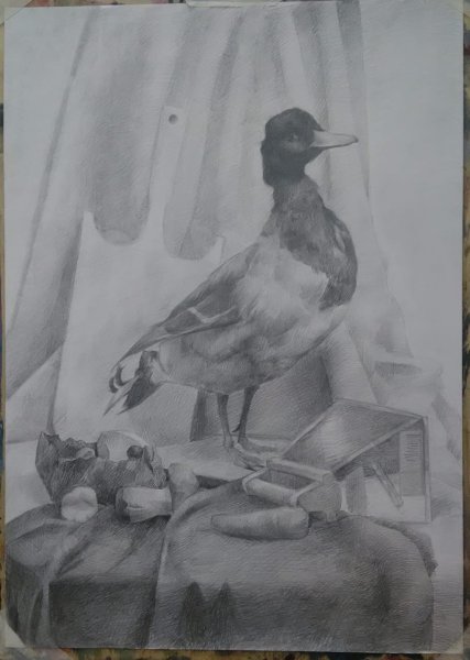 Натюрморт с уткой - это образ изящной и стильной композиции, в которой изображена прекрасная утка. Рисунок привлекает внимание своей точностью и детализацией, позволяя зрителю насладиться красотой и реалистичностью изображенного пернатого животного. Особое внимание уделено деталям каждого пера, отчетливо передавая текстуру и объемность утки. Цветовая гамма рисунка создает атмосферу тепла и комфорта, а мастерство художника позволяет ощутить движение и живость утки на бумаге. Этот натюрморт является прекрасным объектом для любителей живописи, которые ценят искусство в каждой небольшой детали.