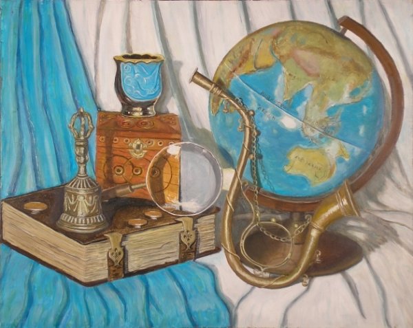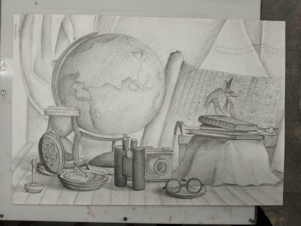 Натюрморт с глобусом и книгами, выполненный карандашом, - это произведение искусства, которое воплощает красоту и глубину знаний. Композиция представляет собой уникальное сочетание реалистичных деталей и творческого подхода автора. Глобус, символизирующий путешествия и открытия, становится центральным элементом натюрморта, окруженного книгами, которые являются источником знаний и образования. Рисунок, выполненный карандашом, придает работе особую эстетическую привлекательность и ощущение ручной работы. Этот натюрморт приглашает зрителя на виртуальное путешествие по миру знаний и помогает расширить свой кругозор.