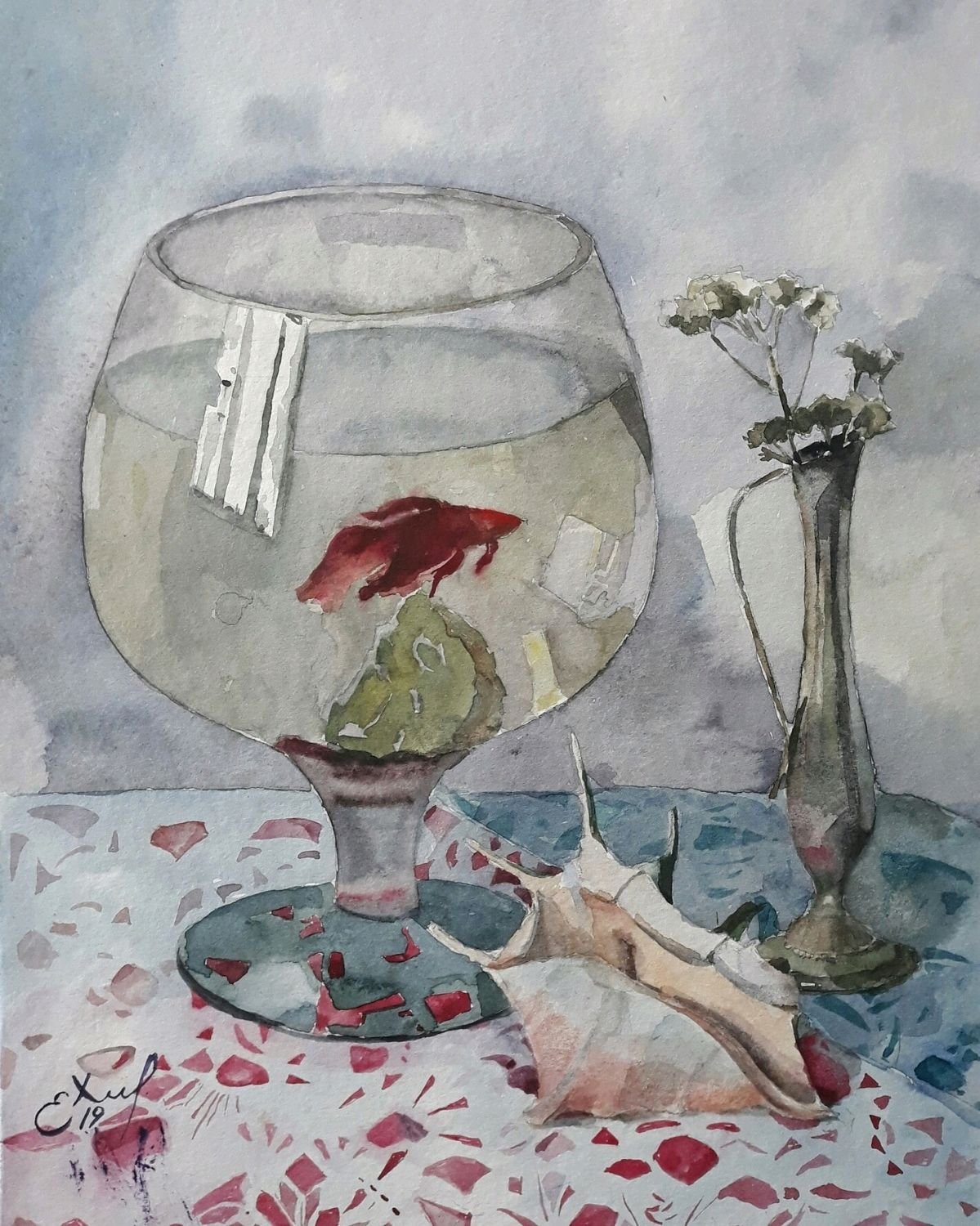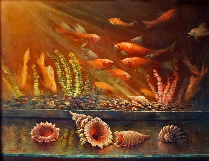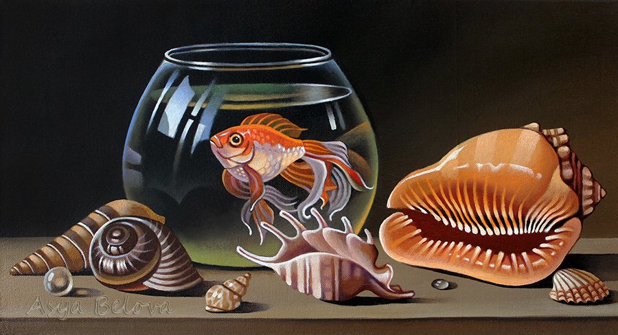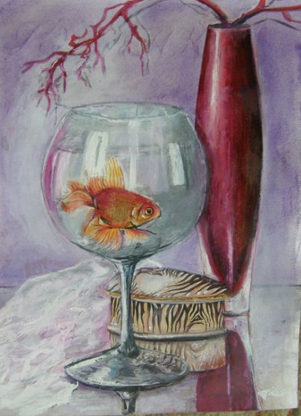 Рисунок натюрморта "Аквариум" воплощает в себе красоту и живость подводного мира. На картине изображены разнообразные рыбки, играющие в ярких цветах, плавающие среди зеленых растений и оживляющие пространство аквариума. Внимательный художник передал каждую деталь с тонкой проработкой, создавая чувство глубины и объема. Этот натюрморт привлекает своей яркостью и энергией, заставляя зрителя почувствовать себя погруженным в удивительный мир подводной жизни.