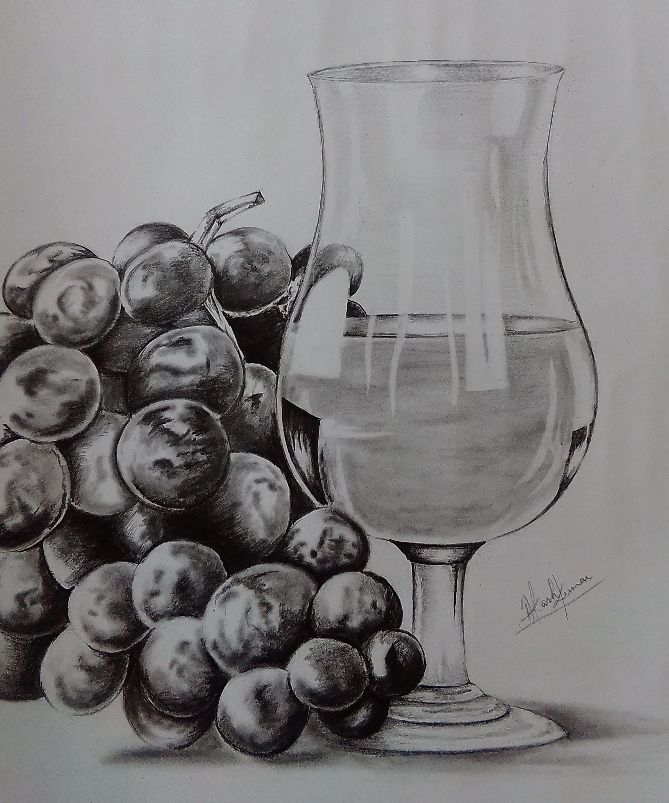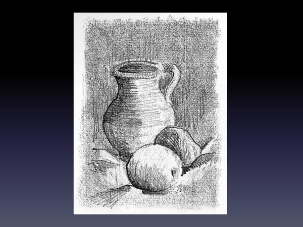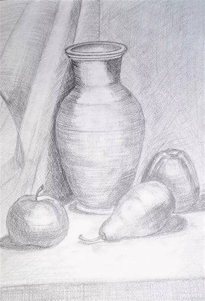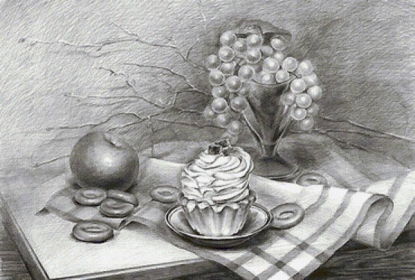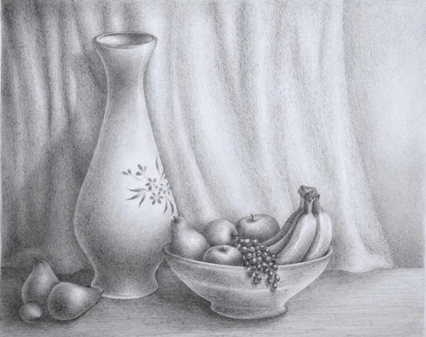 Этот натюрморт, нарисованный простым карандашом, позволяет нам окунуться в мир изящества и прекрасных деталей. Центральным объектом композиции является изящная ваза, которая выглядит очень реалистично благодаря тонким линиям и переливам теней. Ваза наполнена свежими и сочными фруктами - яркими яблоками, спелыми апельсинами и сладкими виноградинками, которые придают картине жизнь и энергию. Благодаря использованию только черно-белой графики, художник передает особую атмосферу и глубину этого произведения искусства. Натюрморт простым карандашом с вазой и фруктами - это идеальное сочетание классической красоты и мастерства рисования.