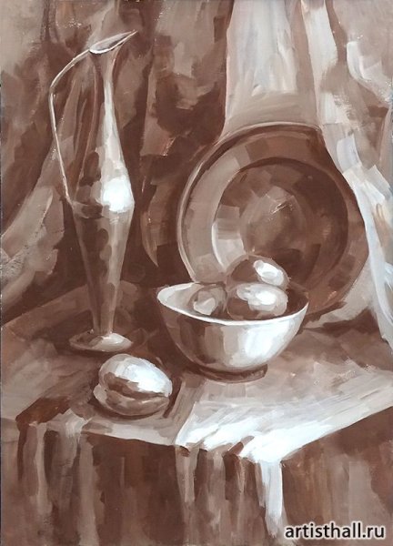 Натюрморт в гризайльной технике - это рисунок, выполненный монотонными оттенками серого с использованием различных градаций. Гризайль создает особую атмосферу и эффектно передает тонкие переходы света и тени. В натюрморте, выполненном в гризайльной технике, каждая деталь тщательно проработана, что делает его особенно выразительным и реалистичным. Этот стиль позволяет добиться глубины и объемности объектов на рисунке, а также играть с контрастами и текстурами. Натюрморты гризайльной техники великолепно подойдут для декорирования интерьера, создавая элегантный и изысканный образ.