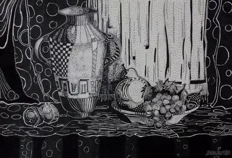 Натюрморт, выполненный гелевой черной ручкой, - это удивительное произведение искусства, которое захватывает взгляд своей точностью и детализацией. Каждая линия и штрих сделаны с мастерством и тщательностью, создавая реалистичное изображение предметов на холсте. Глубокие тени и световые акценты придают рисунку объемность и ощущение реальности. Черная гель-ручка является идеальным инструментом для создания такого натюрморта, так как ее пигментация и контрастность позволяют передать все оттенки и текстуры объектов на полотне. Результат - потрясающая работа искусства, которая заслуживает восхищения и внимания.