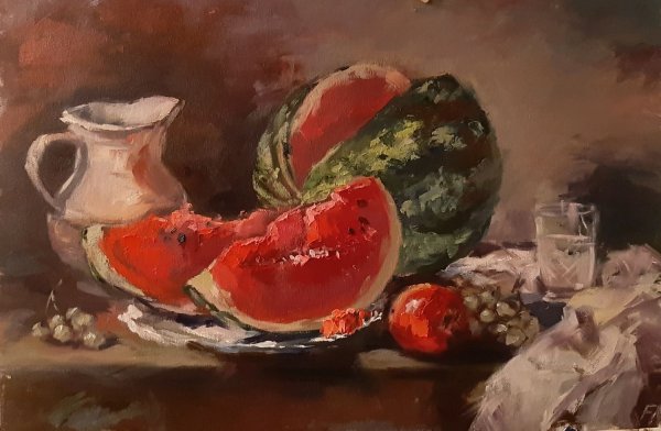 Натюрморт с арбузом - это произведение живописи, которое захватывает внимание зрителя своей яркостью и привлекательностью. В этой композиции художник изображает арбуз, являющийся центральным объектом, в окружении других предметов, таких как фрукты, цветы или посуда. Каждая деталь внимательно проработана, отражая яркость и сочность арбуза, игру света и тени на его поверхности. Это создает ощущение реалистичности и природной красоты, что позволяет зрителю почувствовать аромат и вкус арбуза. Натюрморт с арбузом может быть использован в интерьере, чтобы добавить яркости и свежести в помещение, а также придать ему нотку природной красоты. Он является эстетическим украшением, которое поднимает настроение и завораживает своей простотой и красотой.