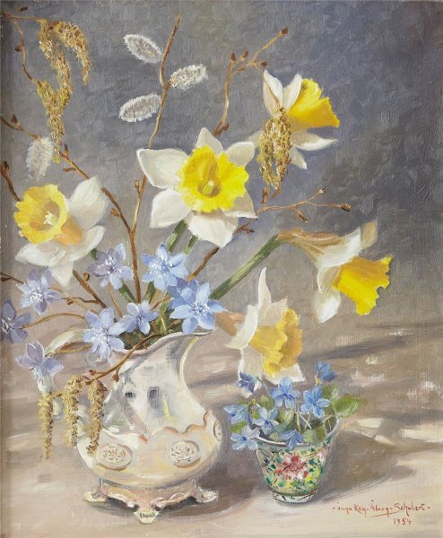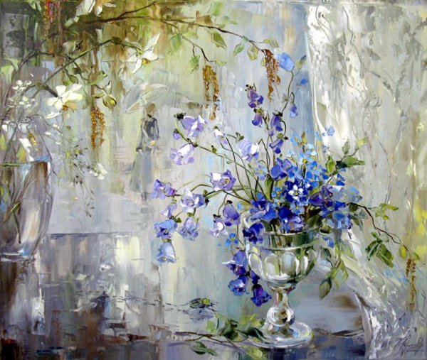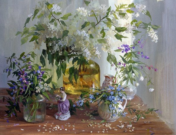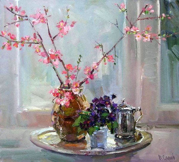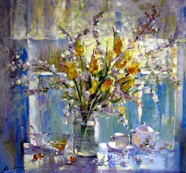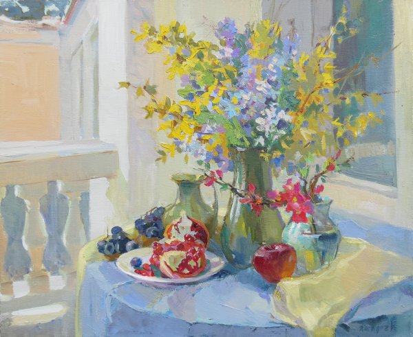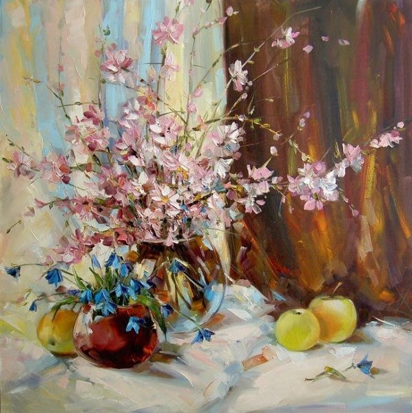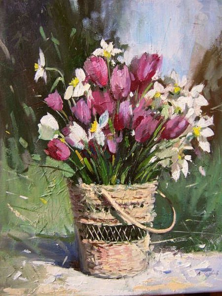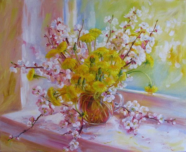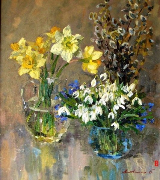 Весенний натюрморт - это произведение живописи, которое передает атмосферу и красоту природы во время весеннего периода. Он обычно включает в себя изображение свежих цветов, расцветающих деревьев, пышной зелени и ярких оттенков. В таком натюрморте можно увидеть разнообразие весенних цветов, таких как тюльпаны, нарциссы, лилии или маки, которые олицетворяют обновление и возрождение после зимней спячки. Красивая живопись весеннего натюрморта позволяет зрителю насладиться прекрасными моментами этого времени года и перенести его в своем воображении.