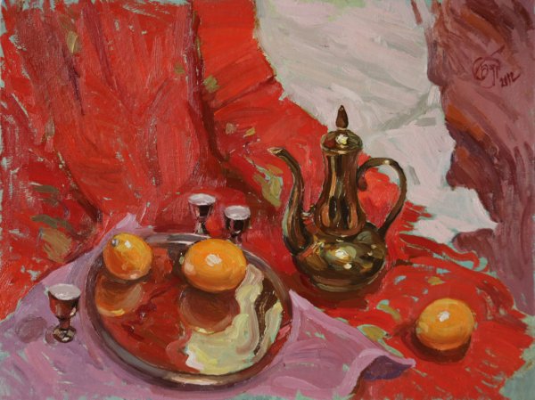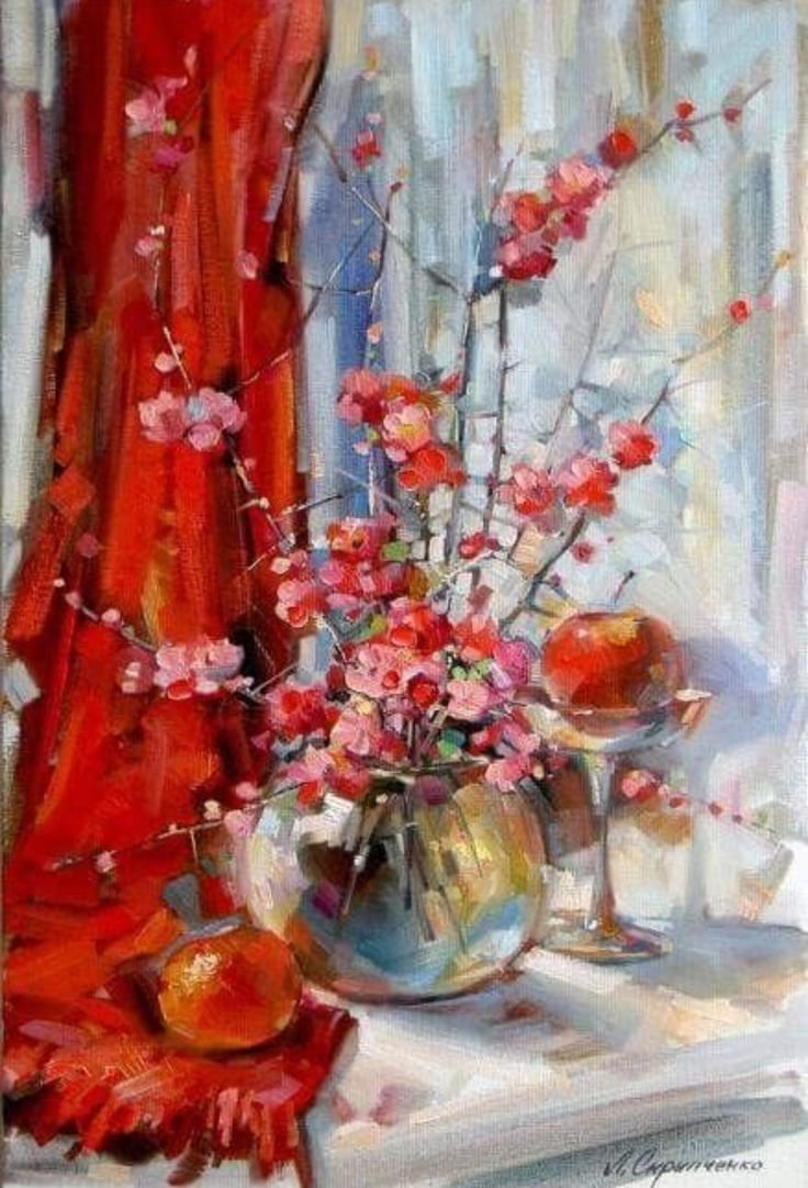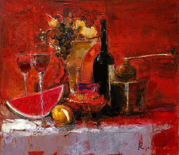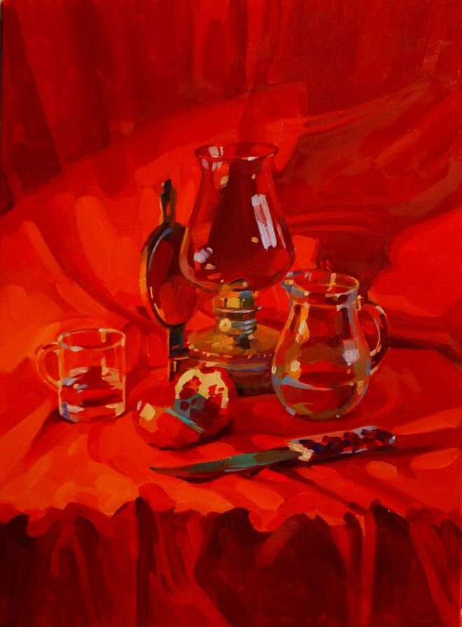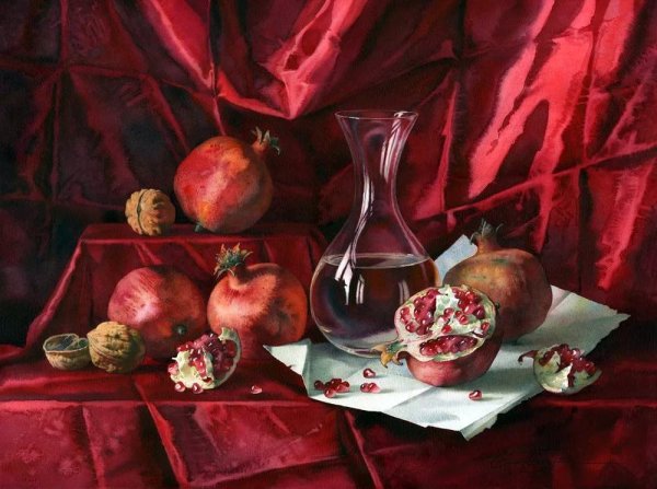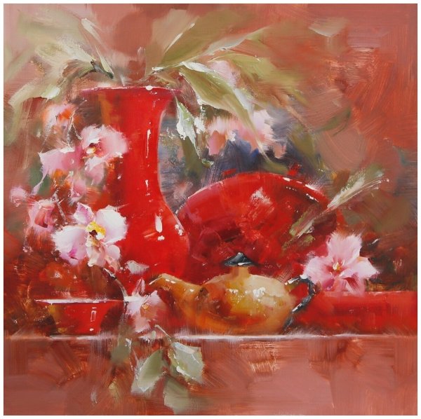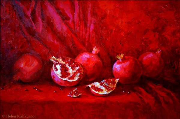 Натюрморт в красных тонах - это живописная композиция, в которой главной цветовой гаммой являются различные оттенки красного цвета. Этот стиль живописи выражает интенсивность и эмоциональность, создавая яркое и запоминающееся впечатление. Красный цвет символизирует силу, страсть и энергию, и его использование в натюрмортах придает им особую динамику и выразительность. Оттенки красного могут быть разнообразными - от темных и насыщенных до светлых и нежных, что позволяет художнику передать различные настроения и эффекты света и тени. Натюрморт в красных тонах вызывает ассоциации с жизненной энергией и наполненностью, пробуждает чувства и восхищение красотой мира.