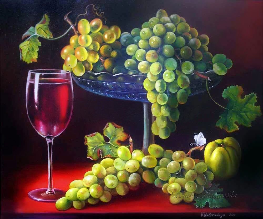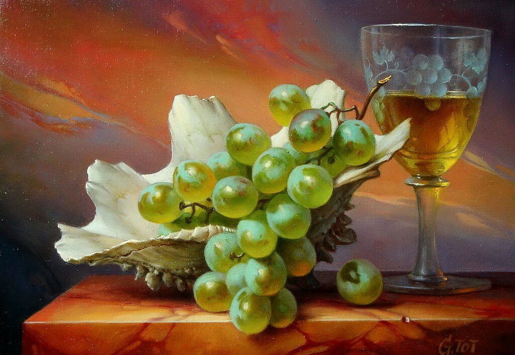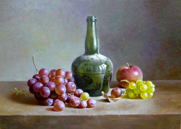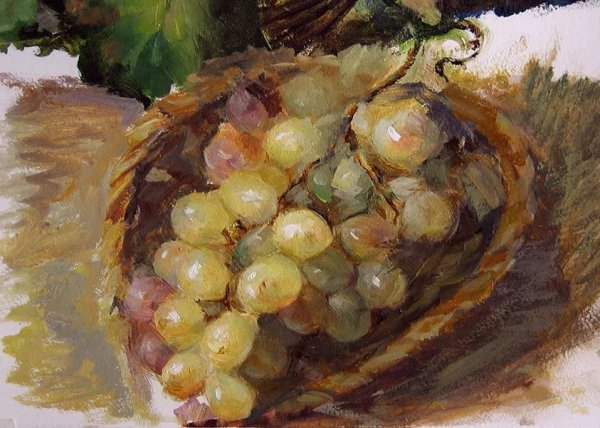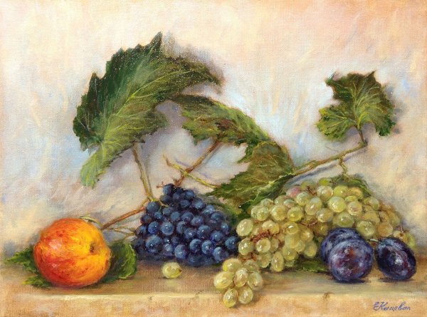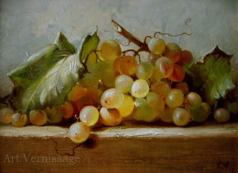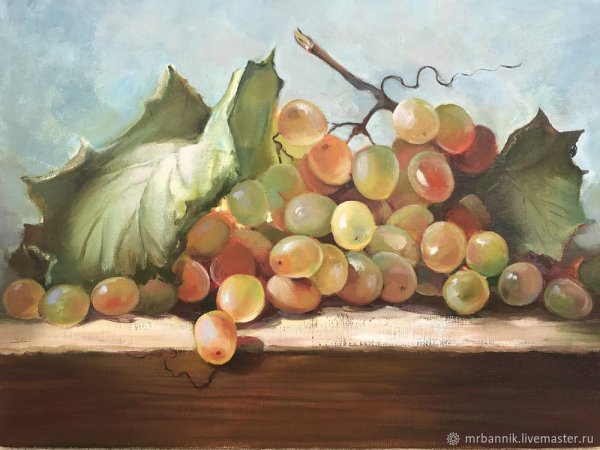 Живопись маслом натюрморт с виноградом - это произведение искусства, которое привлекает своей красотой и эстетикой. В этом натюрморте художник передает нежность и изящество виноградных гроздей, а также их насыщенность и яркость цветов. Каждая ягода отображается с большой детализацией, сохраняя свою оригинальность и естественность. Благодаря использованию масляных красок, работа приобретает глубину и объемность, создавая реалистический эффект. Этот натюрморт с виноградом станет прекрасным украшением для интерьера и подарком для ценителей искусства.
