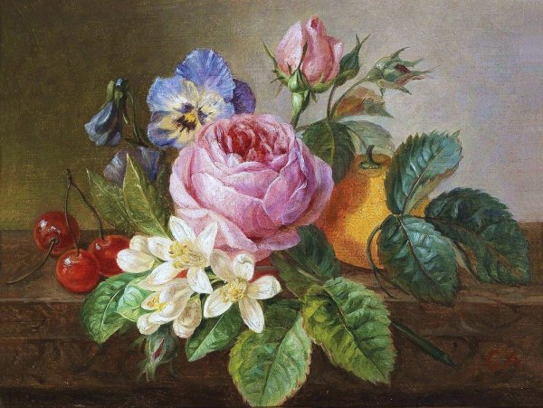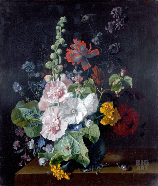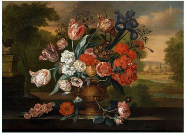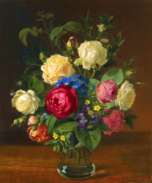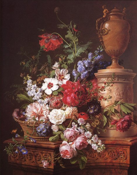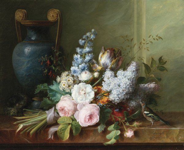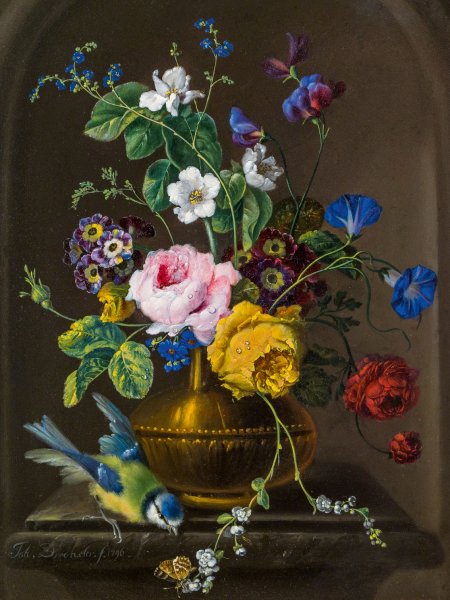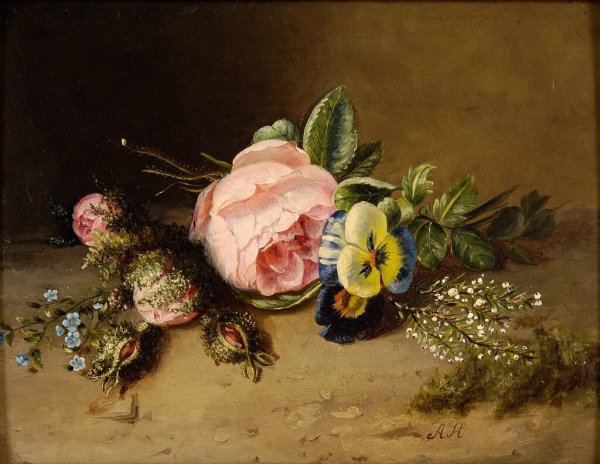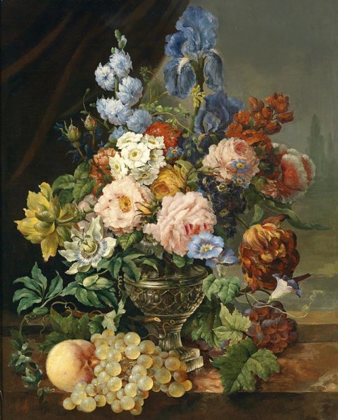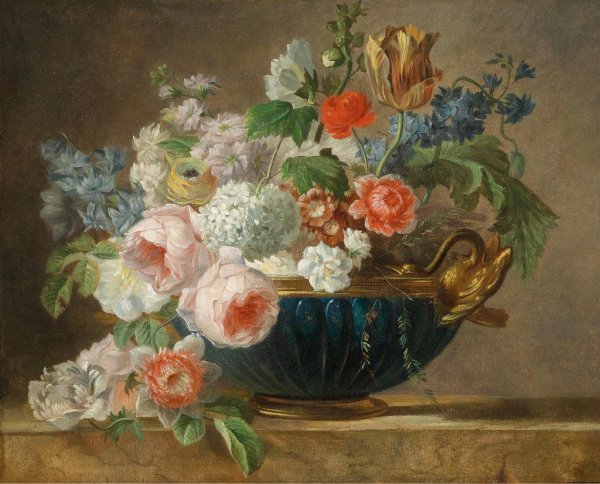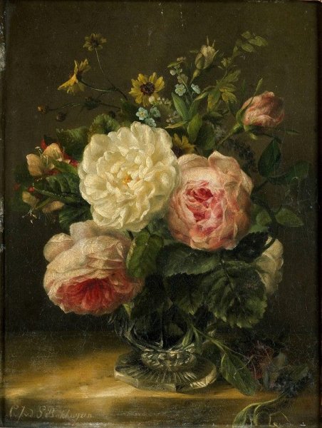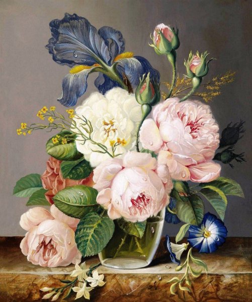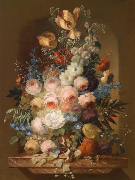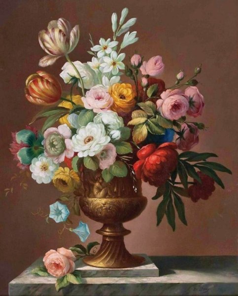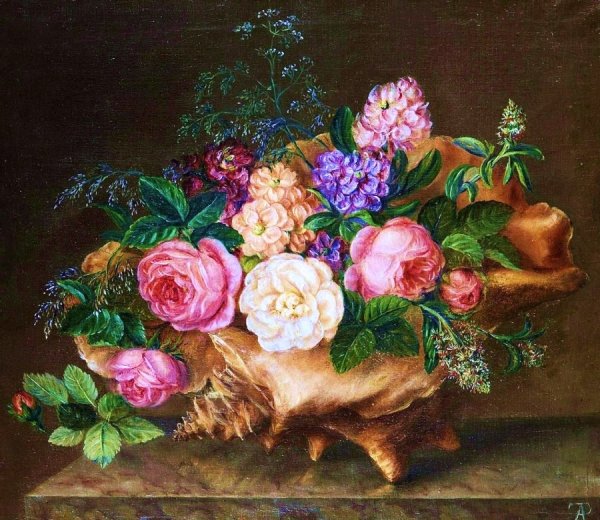 Погрузитесь в атмосферу элегантности и изящества с этим старинным натюрмортом с цветами. Картина передает всю красоту и нежность природы, представляя букет разноцветных цветов на фоне темного фона. Каждая деталь аккуратно проработана, отражая мастерство художника и его внимание к мельчайшим деталям. Изумительное сочетание цветов создает ощущение живости и свежести, словно каждый цветок только что был сорван. Этот старинный натюрморт с цветами является не только великолепным произведением искусства, но и прекрасным украшением для вашего интерьера, добавляя шарм и элегантность любому помещению.