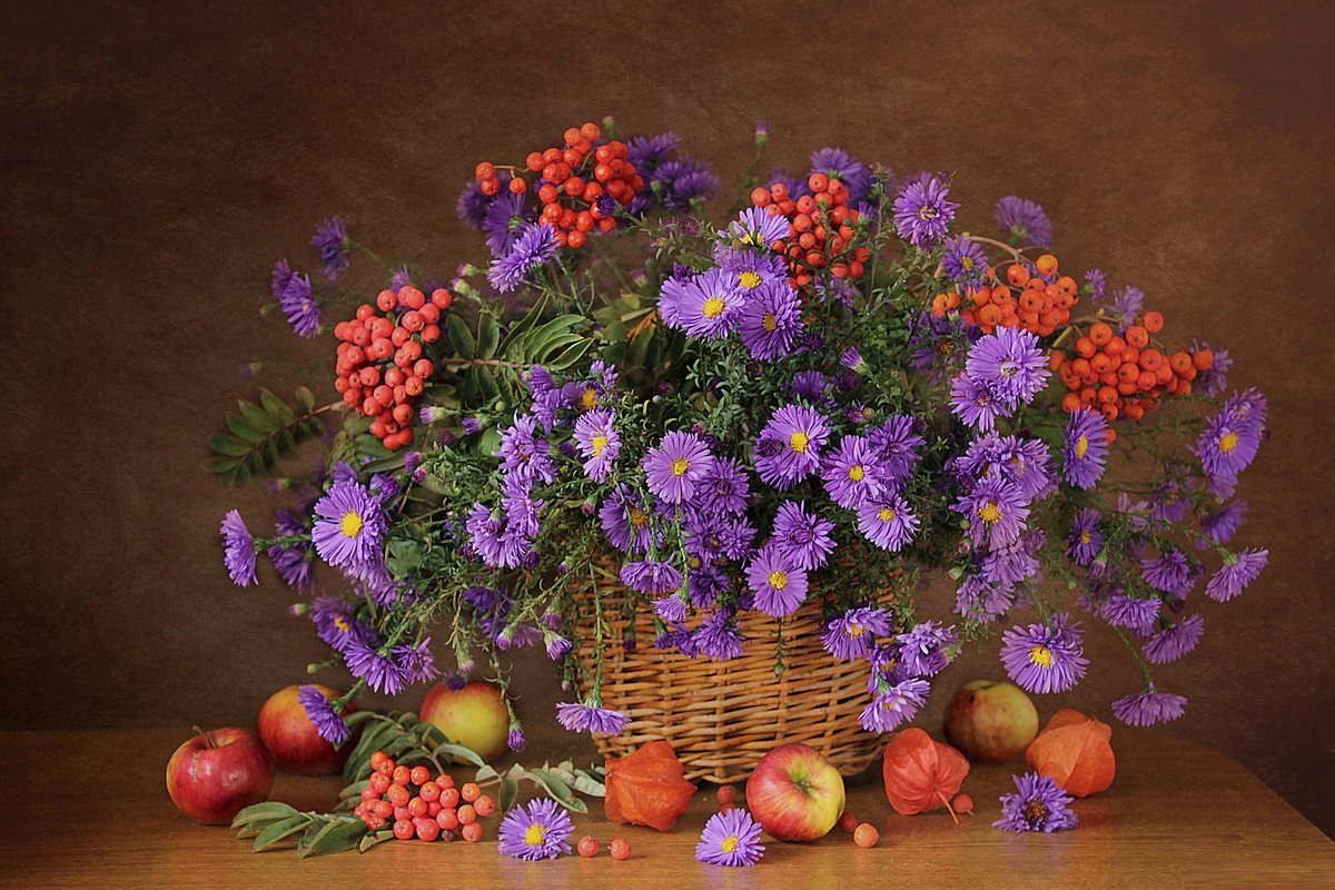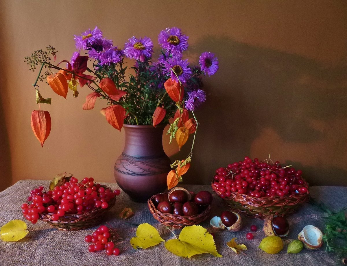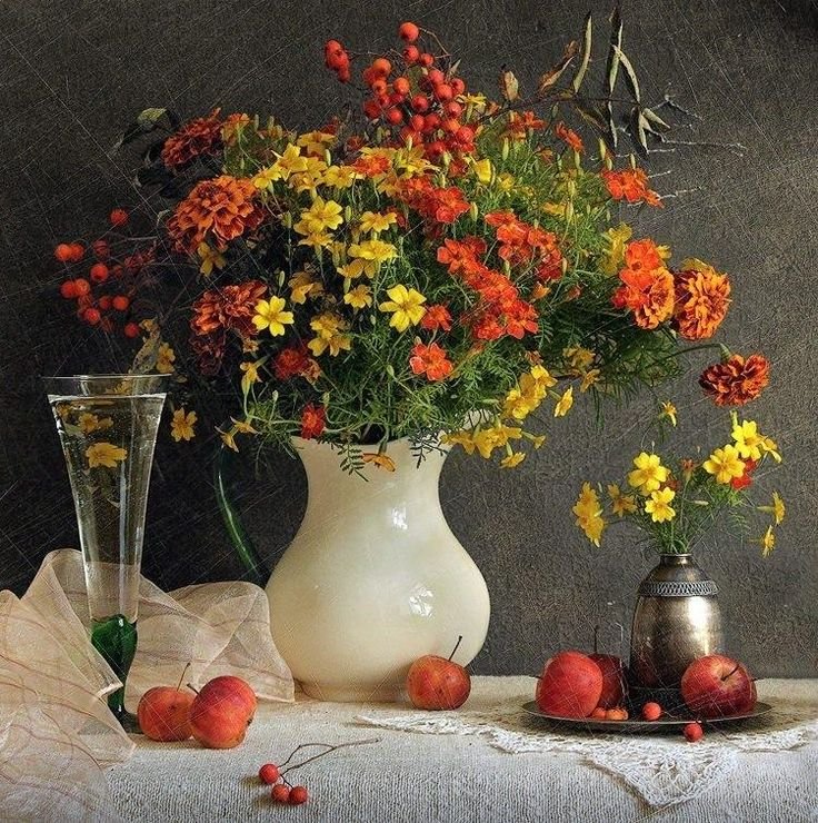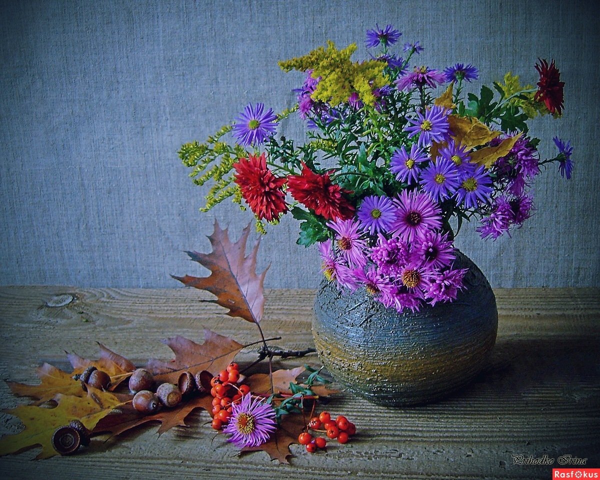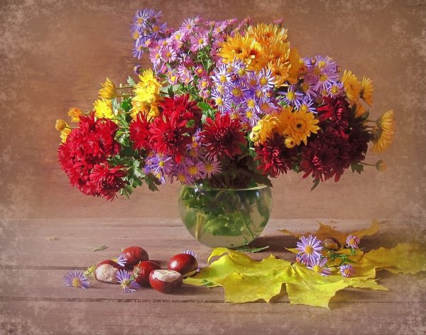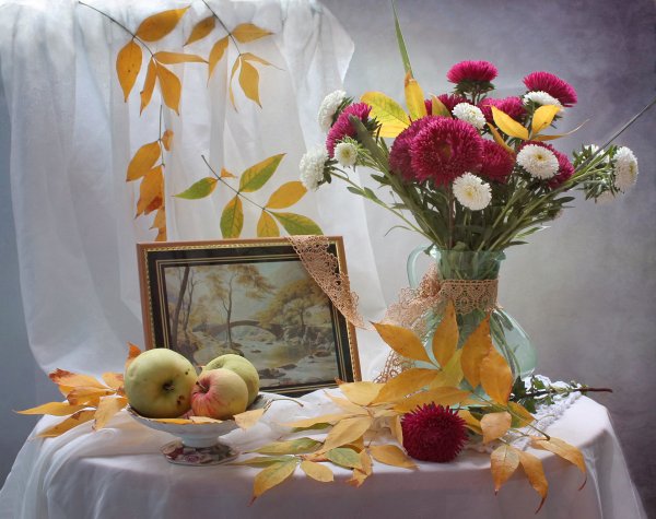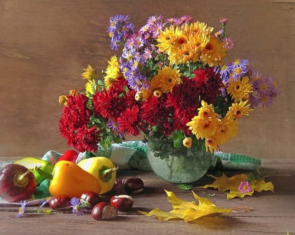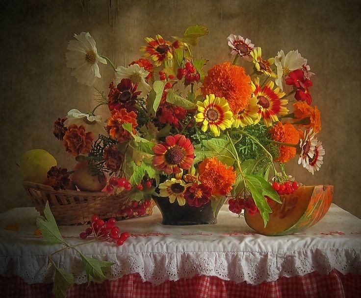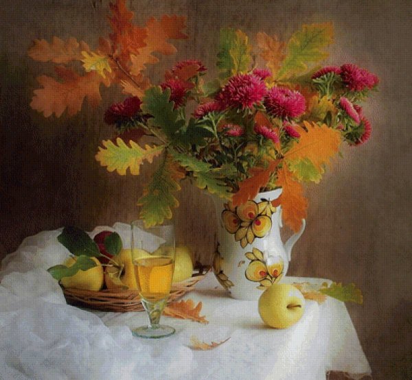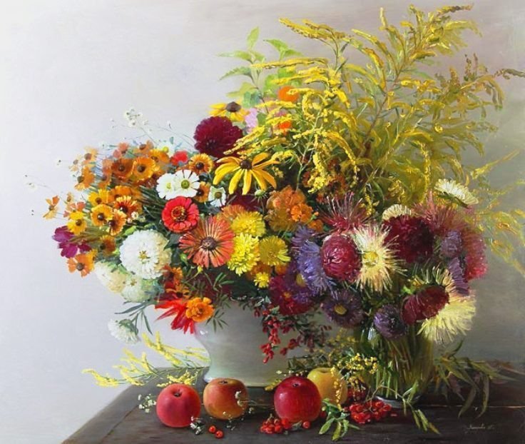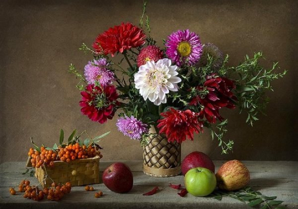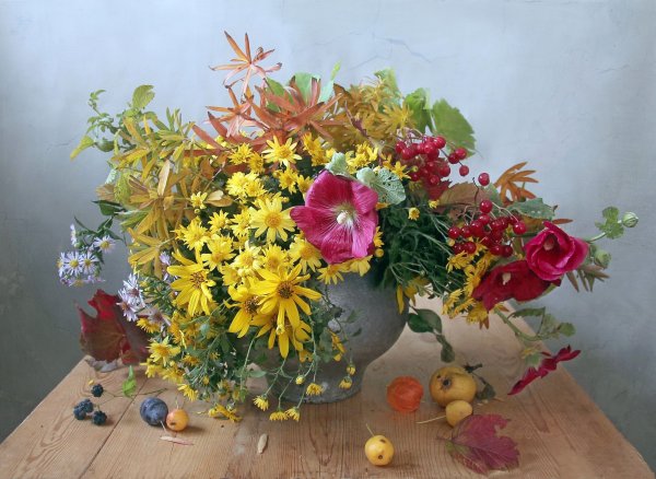 Натюрморт с букетом осенних цветов - это изысканная и яркая композиция, которая позволяет замереть восхищением перед прекрасными цветами природы. В этом натюрморте каждый элемент сочетается с другим, создавая гармоничное впечатление. Осенние листья разных оттенков, как будто они только что упали с деревьев, ароматные и сочные ягоды и нежные цветы, раскрашивающие композицию в теплые оттенки, делают этот натюрморт по-настоящему уникальным. Благодаря мастерскому исполнению художника, каждая кисточка, каждая деталь этих цветов идеально передает их естественную красоту и великолепие. Натюрморт с букетом осенних цветов - это не только произведение искусства, но и способ подарить себе радость и восторг, наслаждаясь удивительным сочетанием цветов и форм.
