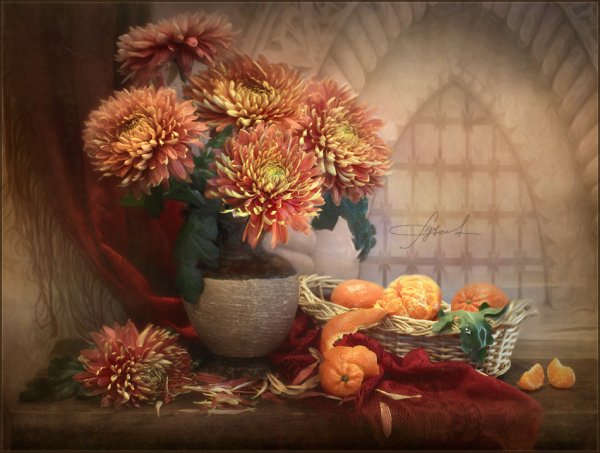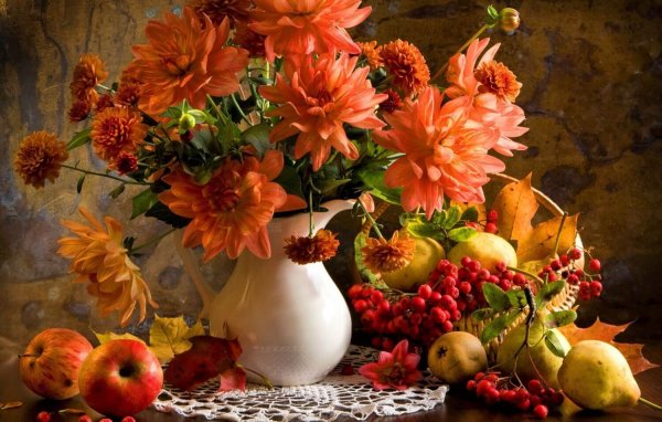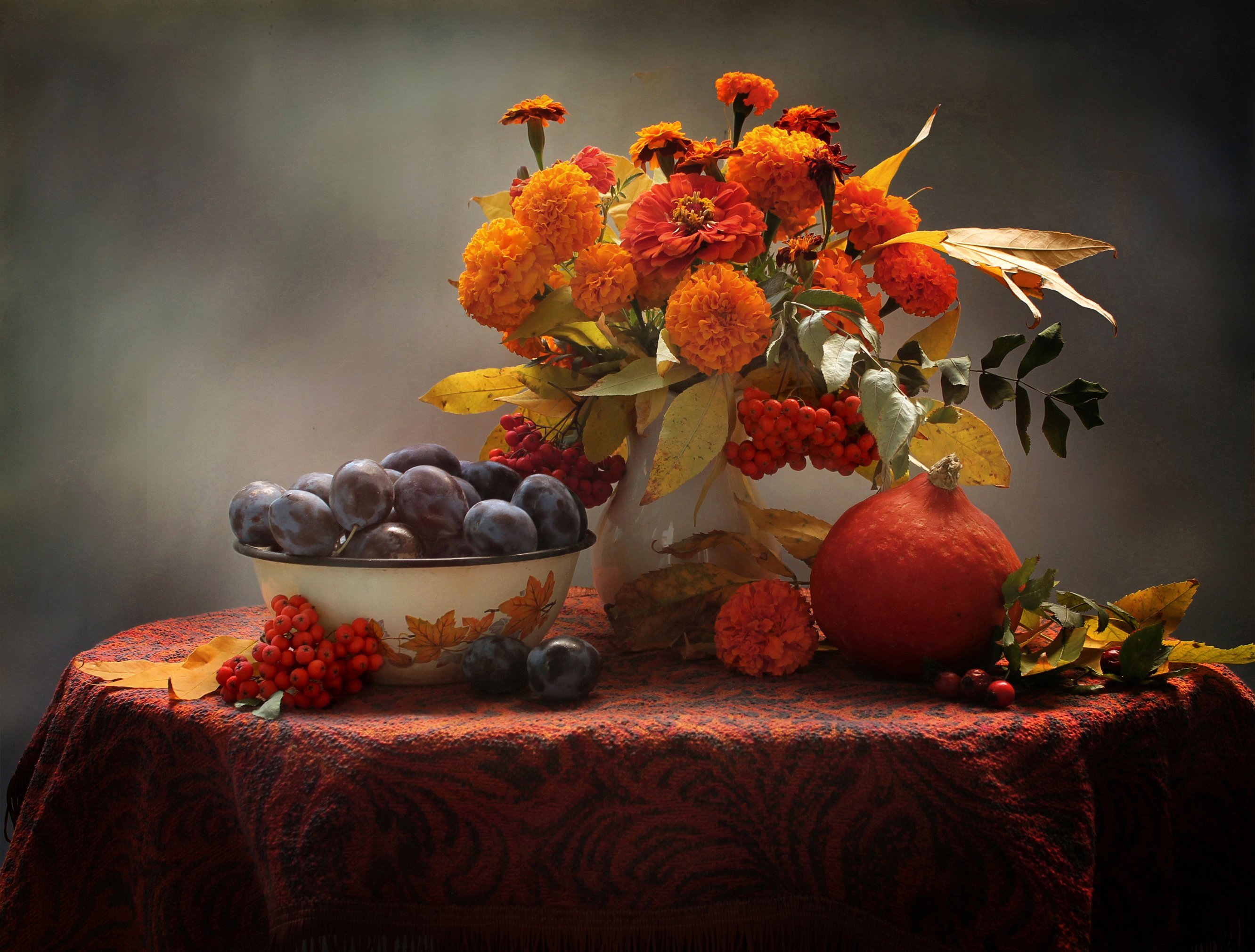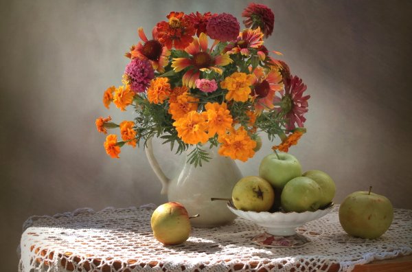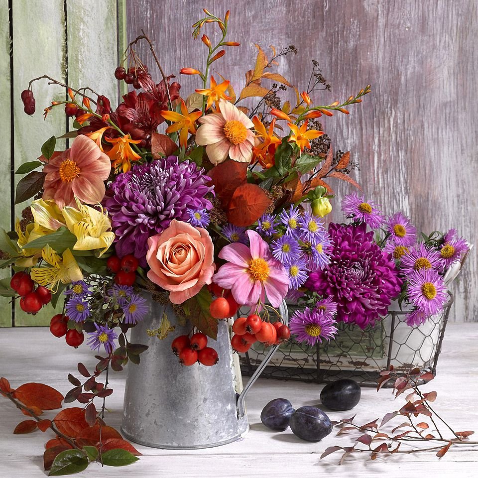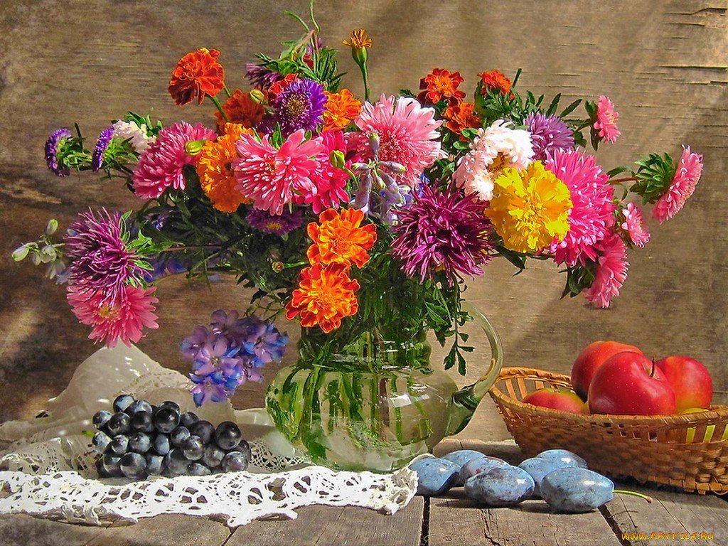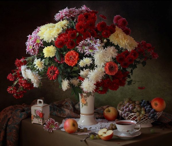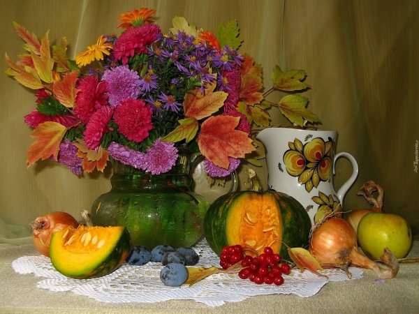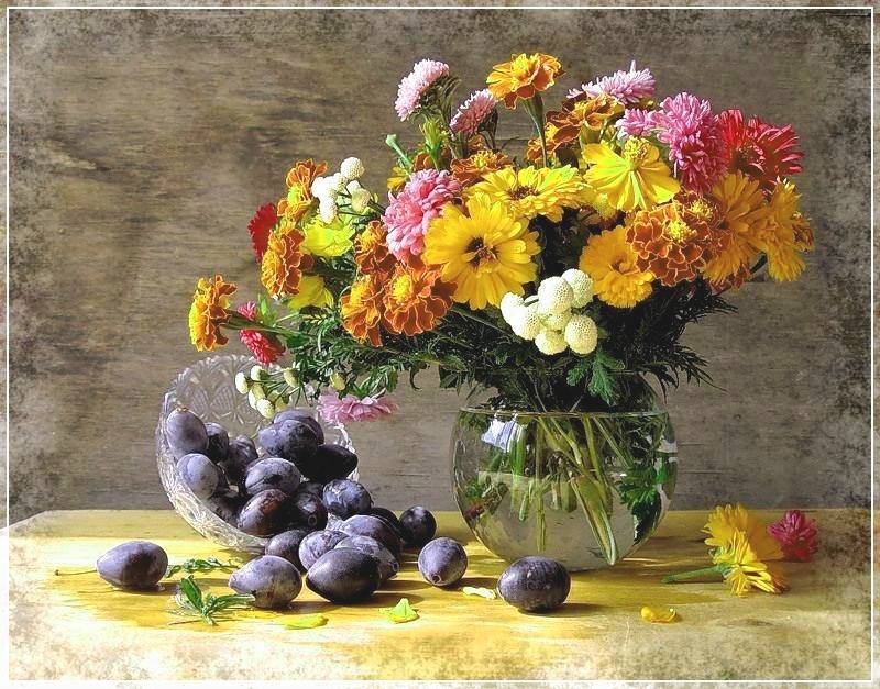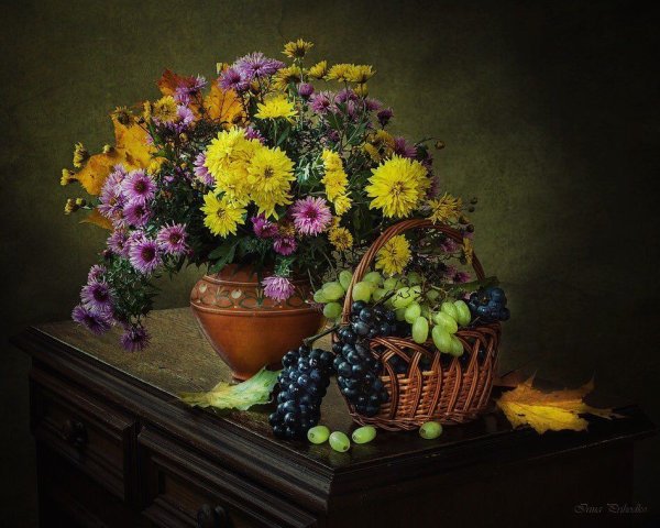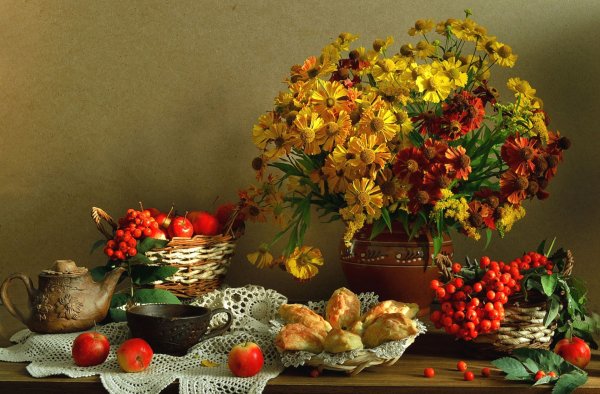 Натюрморт с букетом осенних цветов - это изысканная и яркая композиция, которая позволяет замереть восхищением перед прекрасными цветами природы. В этом натюрморте каждый элемент сочетается с другим, создавая гармоничное впечатление. Осенние листья разных оттенков, как будто они только что упали с деревьев, ароматные и сочные ягоды и нежные цветы, раскрашивающие композицию в теплые оттенки, делают этот натюрморт по-настоящему уникальным. Благодаря мастерскому исполнению художника, каждая кисточка, каждая деталь этих цветов идеально передает их естественную красоту и великолепие. Натюрморт с букетом осенних цветов - это не только произведение искусства, но и способ подарить себе радость и восторг, наслаждаясь удивительным сочетанием цветов и форм.