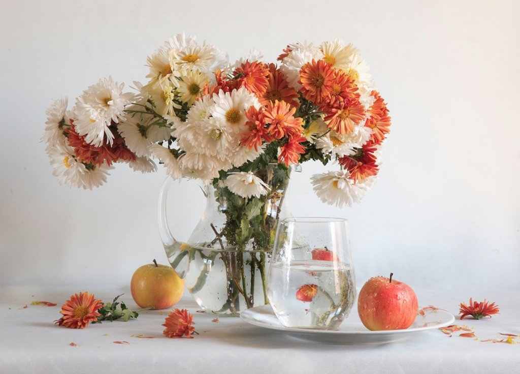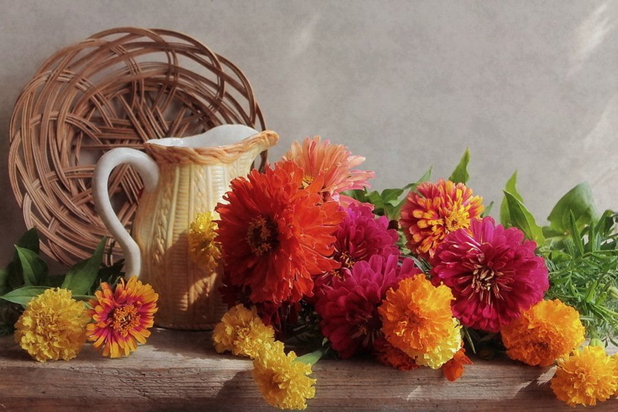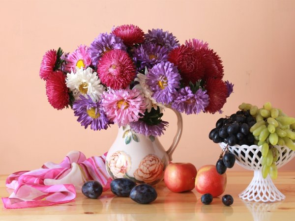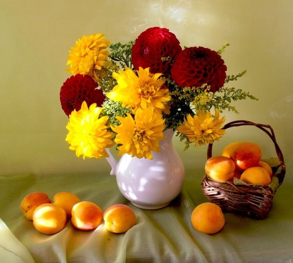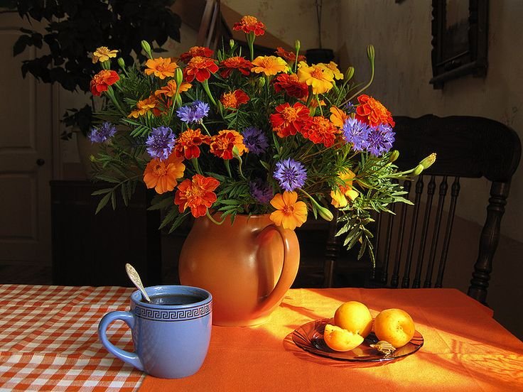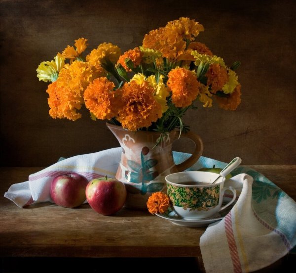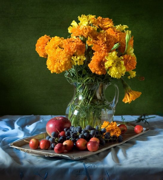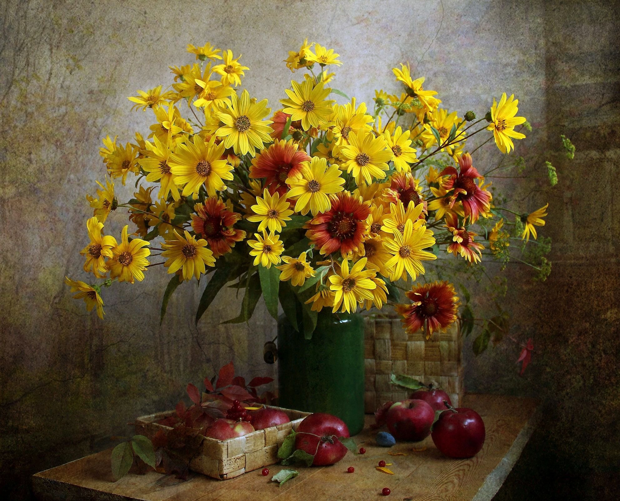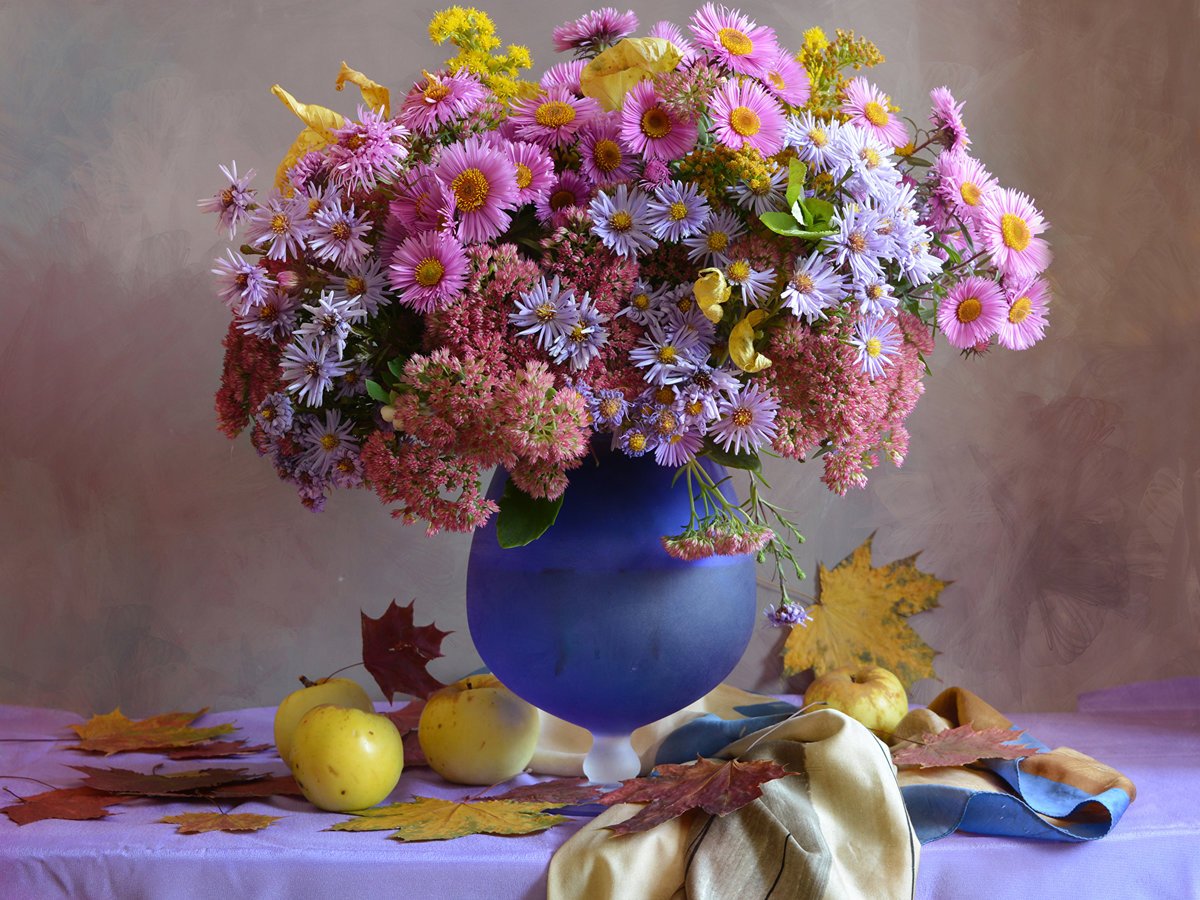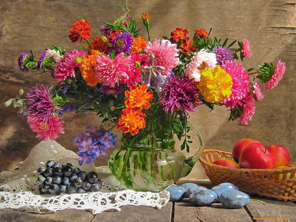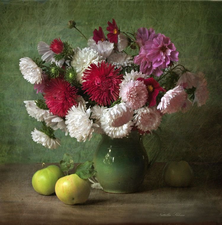 Натюрморт с букетом осенних цветов - это изысканная и яркая композиция, которая позволяет замереть восхищением перед прекрасными цветами природы. В этом натюрморте каждый элемент сочетается с другим, создавая гармоничное впечатление. Осенние листья разных оттенков, как будто они только что упали с деревьев, ароматные и сочные ягоды и нежные цветы, раскрашивающие композицию в теплые оттенки, делают этот натюрморт по-настоящему уникальным. Благодаря мастерскому исполнению художника, каждая кисточка, каждая деталь этих цветов идеально передает их естественную красоту и великолепие. Натюрморт с букетом осенних цветов - это не только произведение искусства, но и способ подарить себе радость и восторг, наслаждаясь удивительным сочетанием цветов и форм.