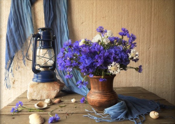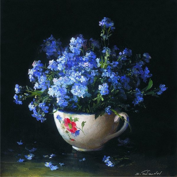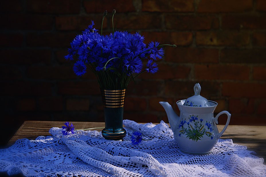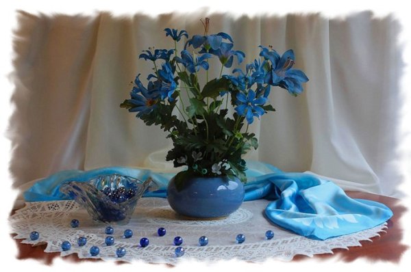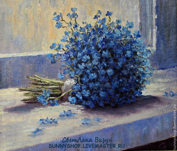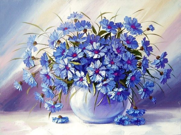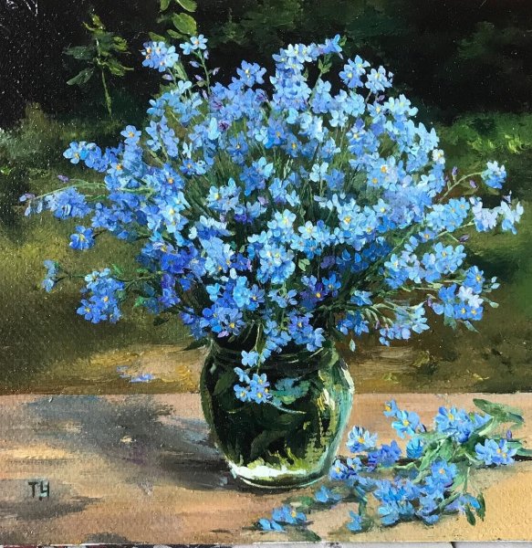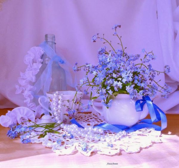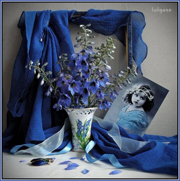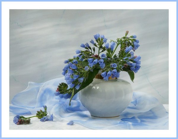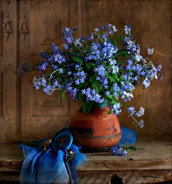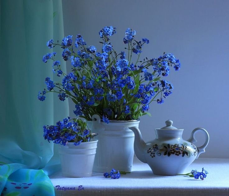 Натюрморт с голубыми цветами - это произведение искусства, которое восхищает своей красотой и нежностью. Он состоит из различных предметов, украшенных голубыми цветами, создавая гармоничную композицию. Голубые оттенки придают этому натюрморту особую атмосферу спокойствия и благополучия. Взглянув на эту картину, можно почувствовать легкость и свежесть этих цветов, которые придают ей некую мечтательность и романтичность. Натюрморт с голубыми цветами является прекрасным дополнением для интерьера, создавая ощущение уюта и приятного настроения.