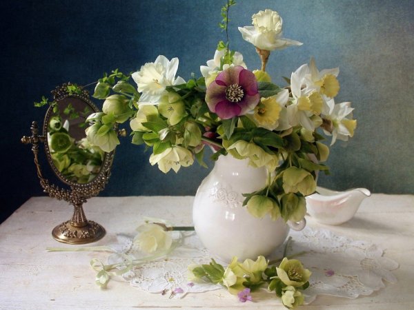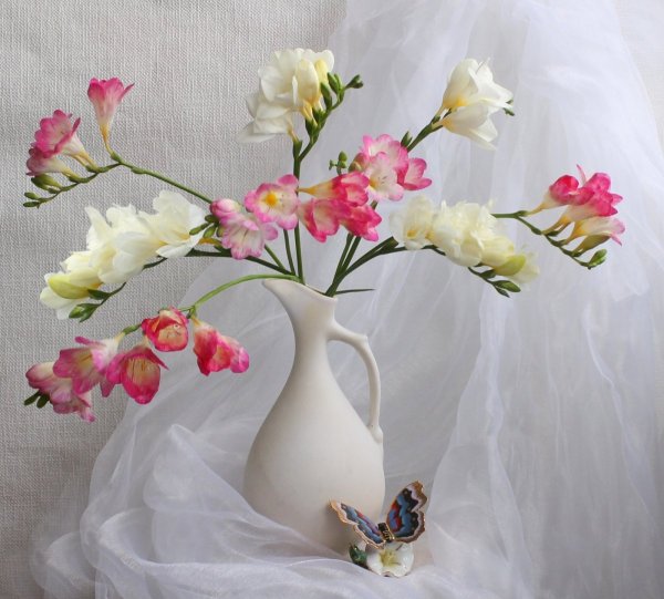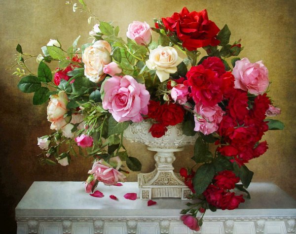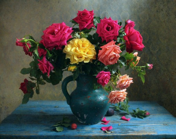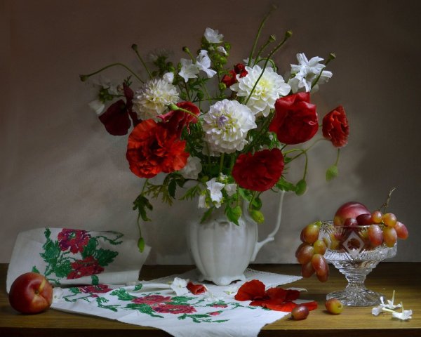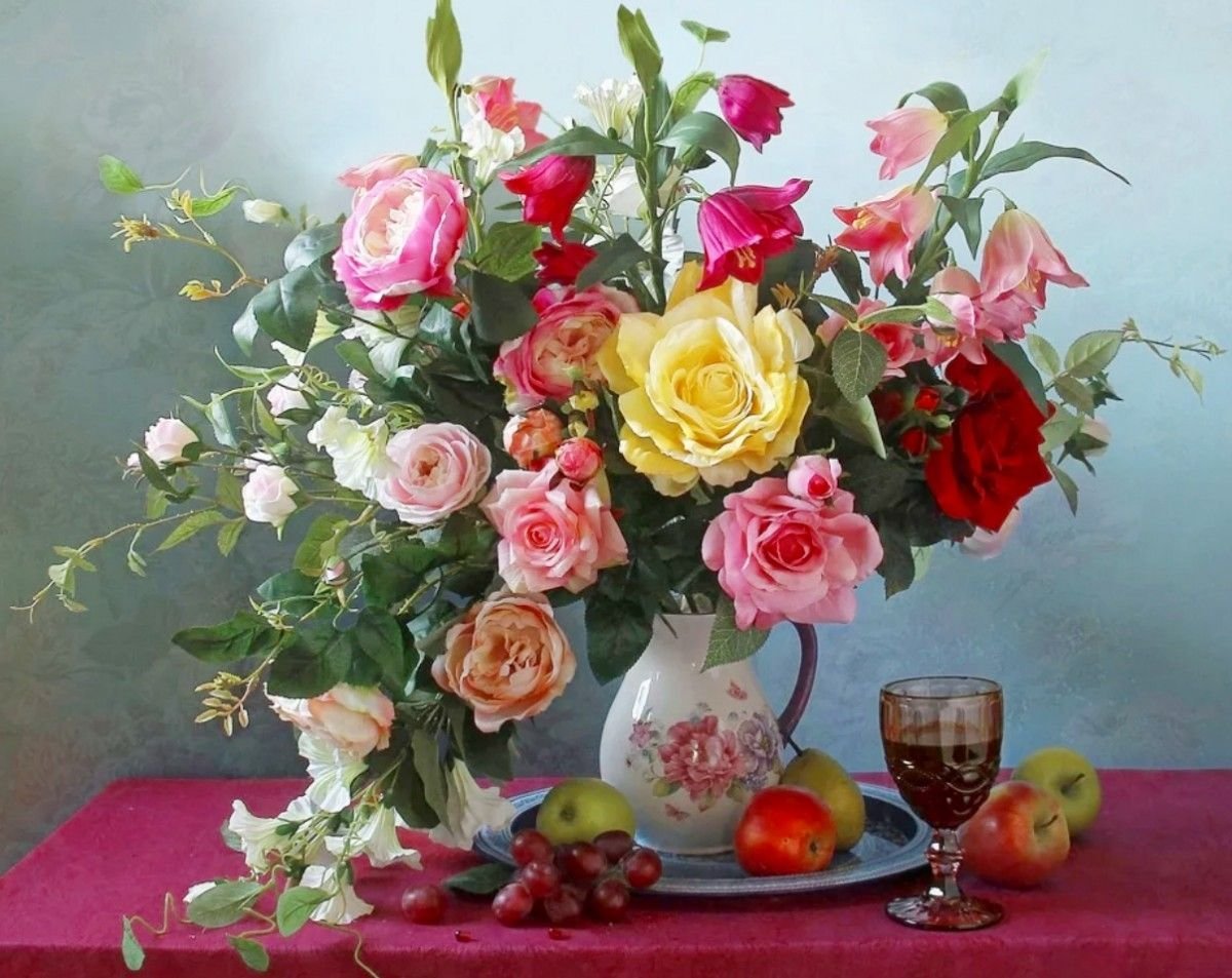 Шикарный натюрморт с цветами - это потрясающее произведение искусства, которое привлекает внимание своей красотой и элегантностью. Композиция составлена из разнообразных цветов, создавая яркую палитру, наполняющую пространство ароматными и привлекательными оттенками. Каждый цветок является уникальным и обладает своей индивидуальной прелестью, что придает натюрморту особую гармонию и выразительность. Благодаря искусному использованию света и теней, этот натюрморт создает ощущение живой присутствия цветов перед зрителем, заставляя его насладиться их неповторимой красотой и изяществом. Независимо от места, где будет размещен, этот натюрморт с цветами будет привлекать восхищенные взгляды и добавлять шарма и элегантности в интерьере.