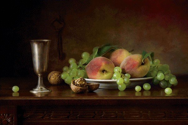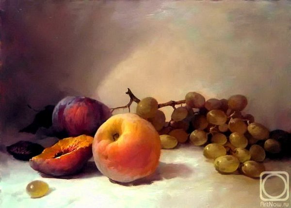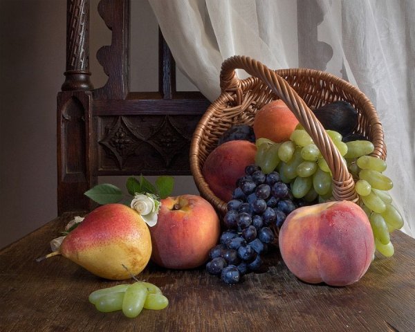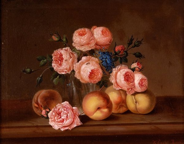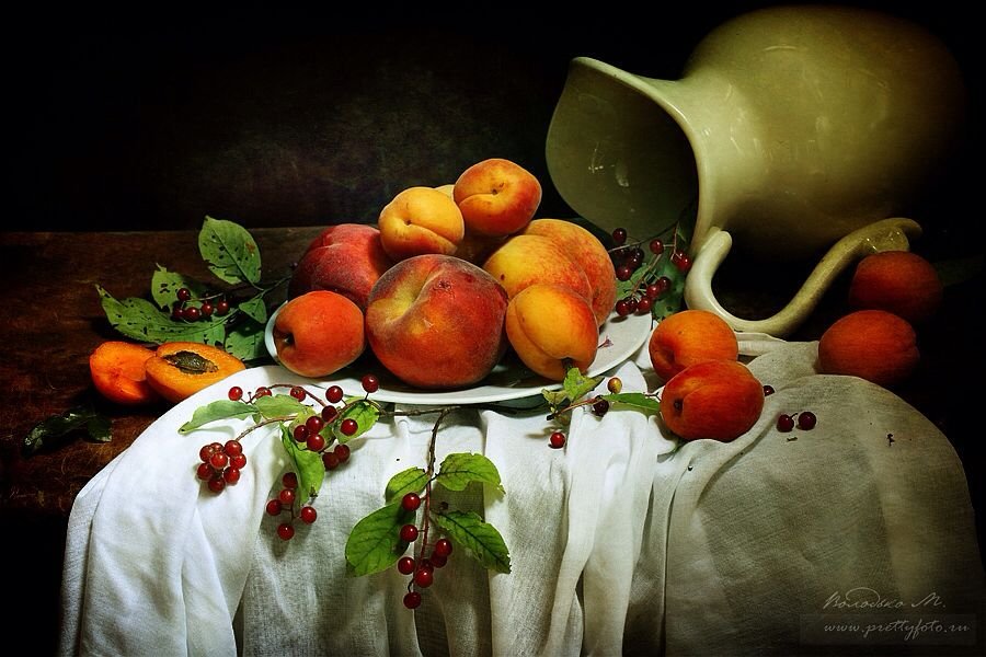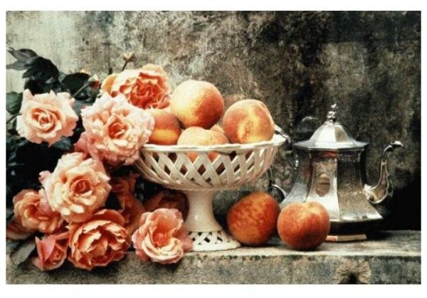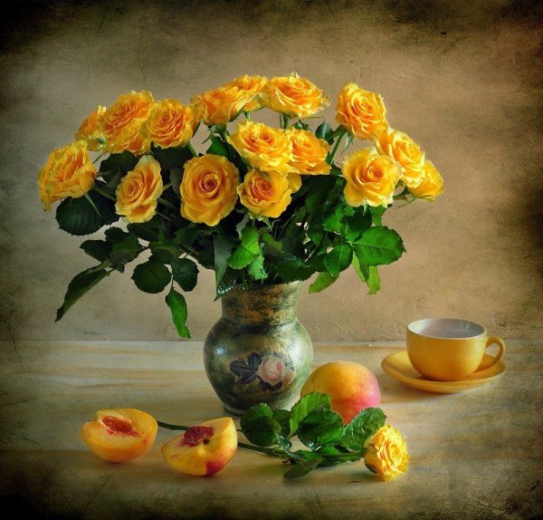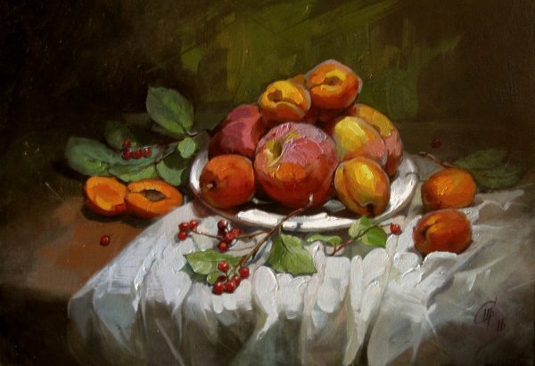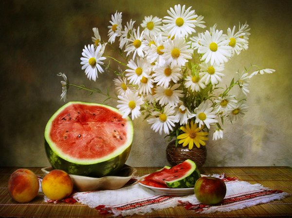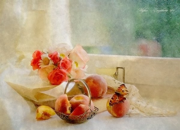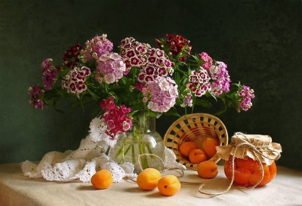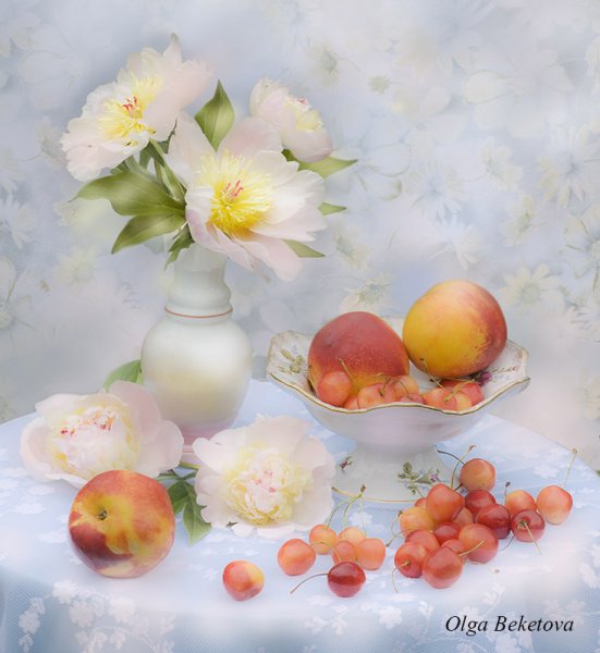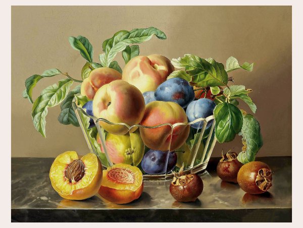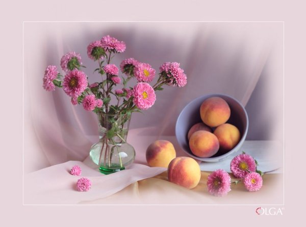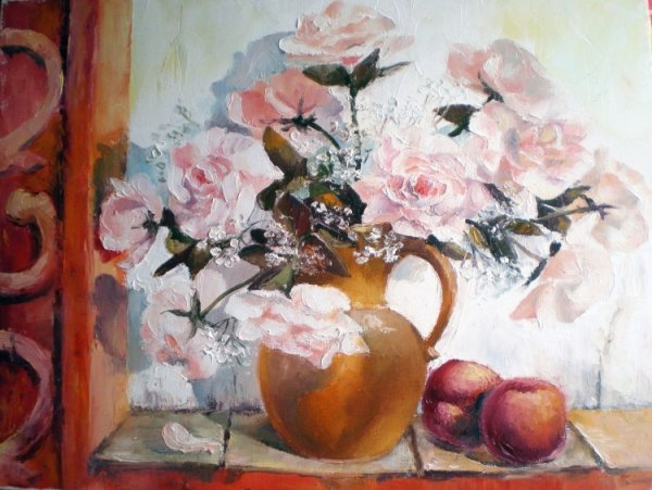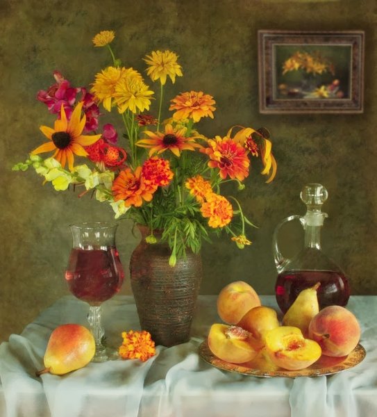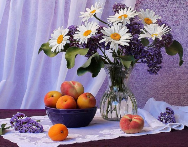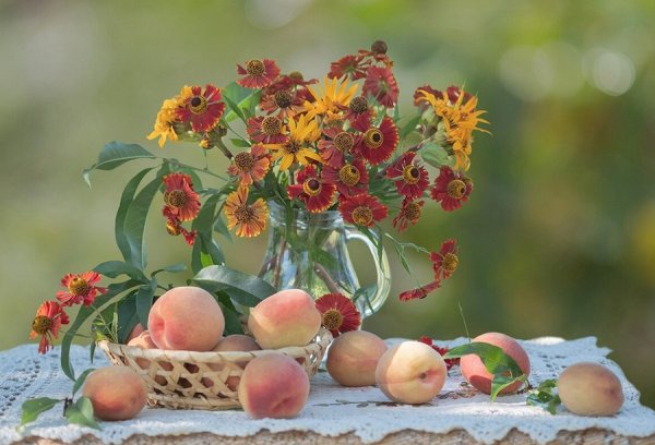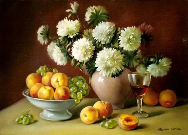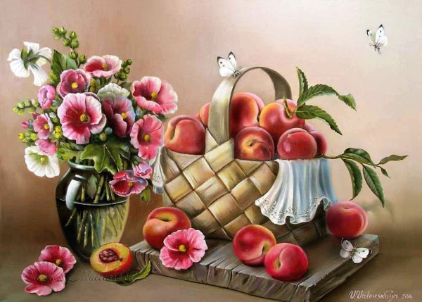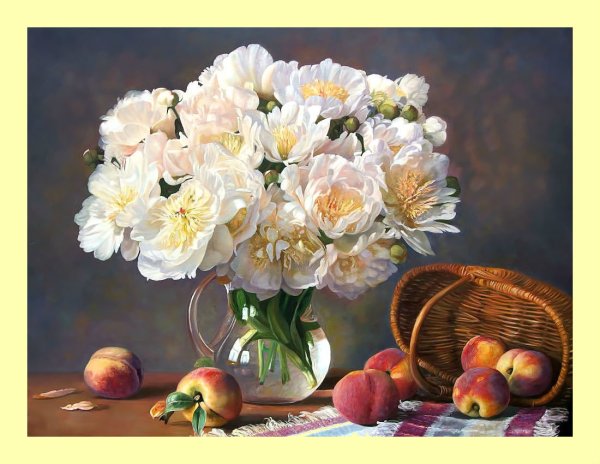 Натюрморт с цветами и персиками - это прекрасное произведение искусства, которое сочетает в себе красоту живых цветов и аромат сочных персиков. Этот натюрморт погружает нас в мир природы, наполняя наши сенсорные ощущения яркими оттенками и ароматами. Каждая деталь этой композиции тщательно выверена - от изящной формы персиков до богатого разнообразия цветов. Это произведение искусства приглашает нас насладиться красотой природы и увидеть её великолепие через глаза художника.