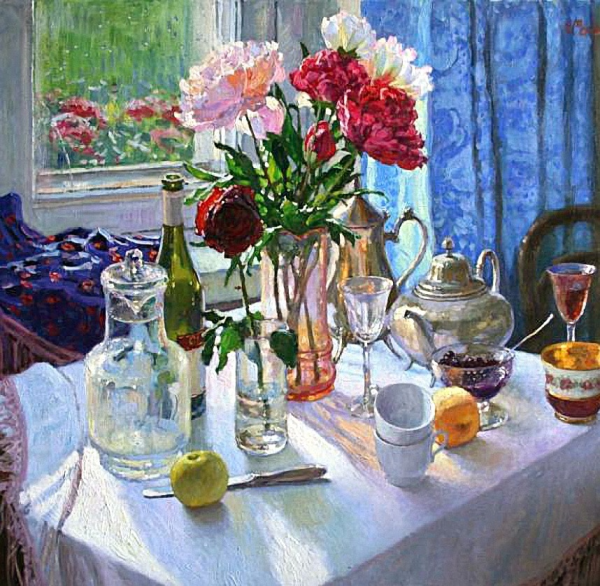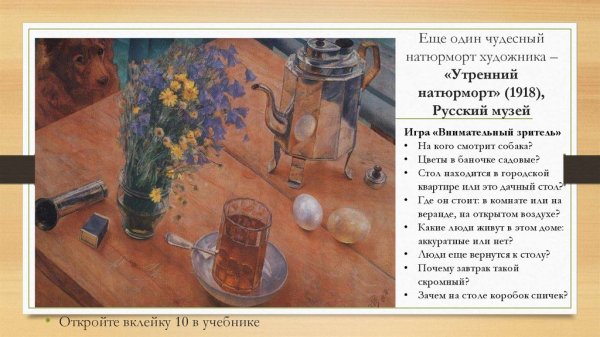 Картина "Утренний натюрморт" воссоздает прекрасную атмосферу раннего утра, когда все еще тихо и спокойно. Через нежные кистевые штрихи художник передает свежесть и яркость пробуждающейся природы. На полотне можно увидеть великолепные цветочные композиции, сделанные из разных видов цветов, которые ласкают глаз своими насыщенными оттенками. Изображение также подчеркивается игрой света и тени, которые создают объемность и глубину. Картина "Утренний натюрморт" поражает своей красотой и приглашает зрителя замечать прекрасное в мельчайших деталях окружающего мира.