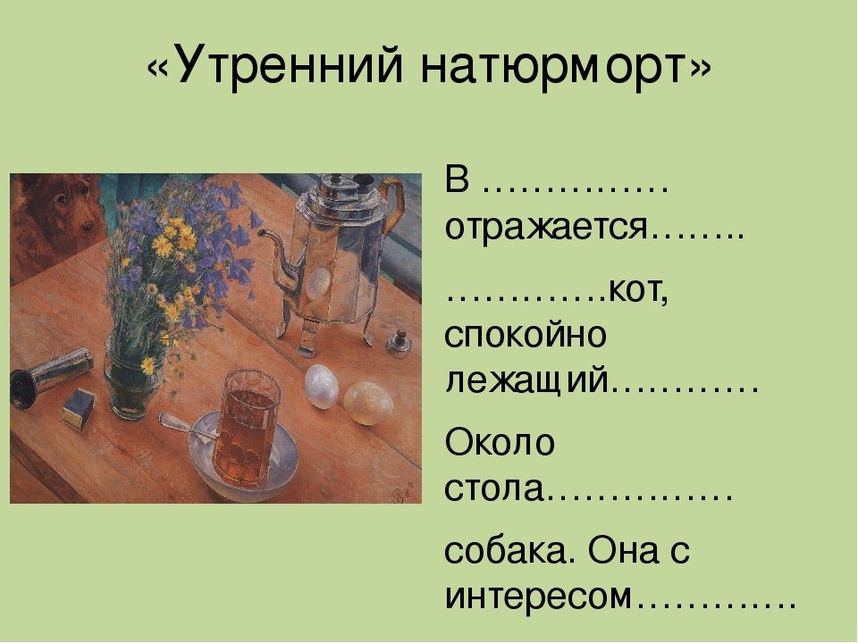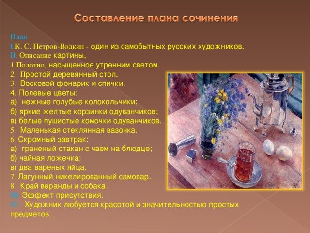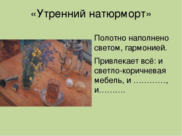 Натюрморт "Картина Петрова Водкина" - это произведение искусства, которое является прекрасным примером мастерства русского художника Петра Водкина. В этой картинах удивительно сочетаются тонкий вкус и талант автора, оживляя обыденные предметы и придают им особую глубину и значимость. Водкин с особым мастерством передает детали и текстуры каждого объекта на своей картине - от разноцветных фруктов до нежных цветов и композиций. Каждый элемент натюрморта создает атмосферу спокойствия и гармонии, раскрывая перед зрителем изысканность и эстетическую ценность этих простых вещей. Натюрморт "Картина Петрова Водкина" является истинным шедевром, который не только радует глаз своей красотой, но и заставляет задуматься о скрытых значениях и символике, которые он несет в себе.