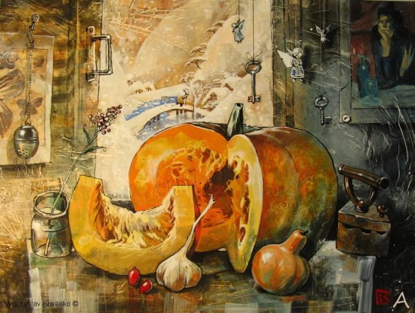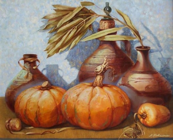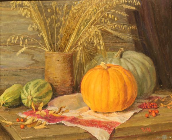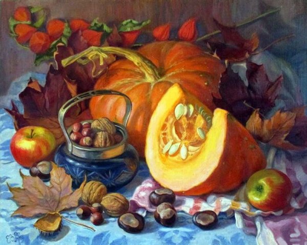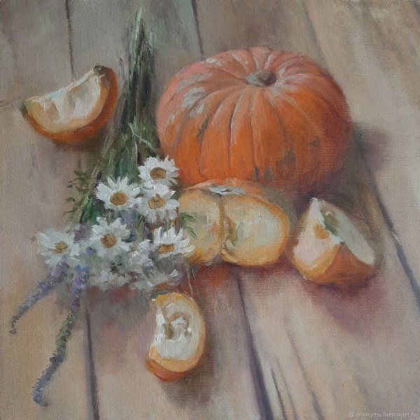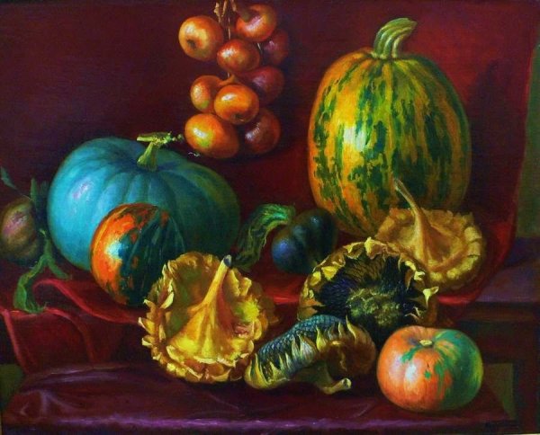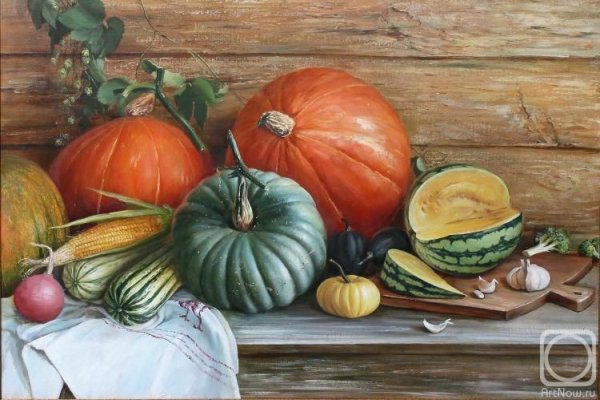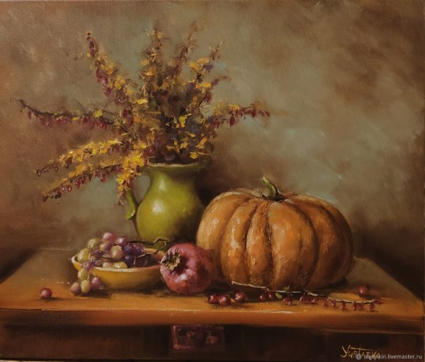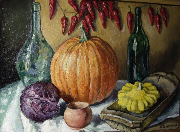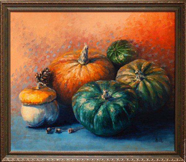 Картина "Натюрморт с тыквой" - это произведение искусства, которое захватывает взгляд своей простотой и одновременно удивительной красотой. В центре композиции расположена огромная тыква, которая притягивает внимание своей яркостью и насыщенностью цвета. Ее округлая форма и рельефная поверхность создают ощущение объемности и реалистичности. Изящно расположенные рядом фрукты и другие предметы придают картине гармоничность и баланс. Чудесная игра света и тени добавляет глубину и объемности изображению, делая его почти трехмерным. Картина "Натюрморт с тыквой" вызывает чувство природного богатства и обещает нам умиротворение и уют в нашем доме.