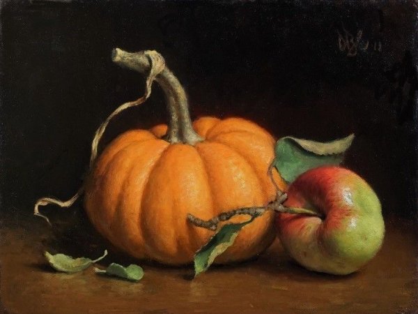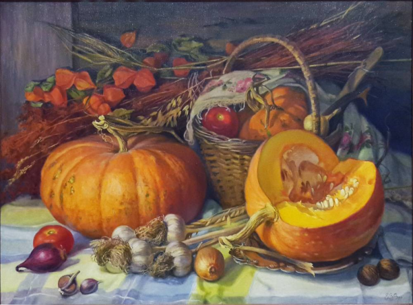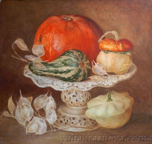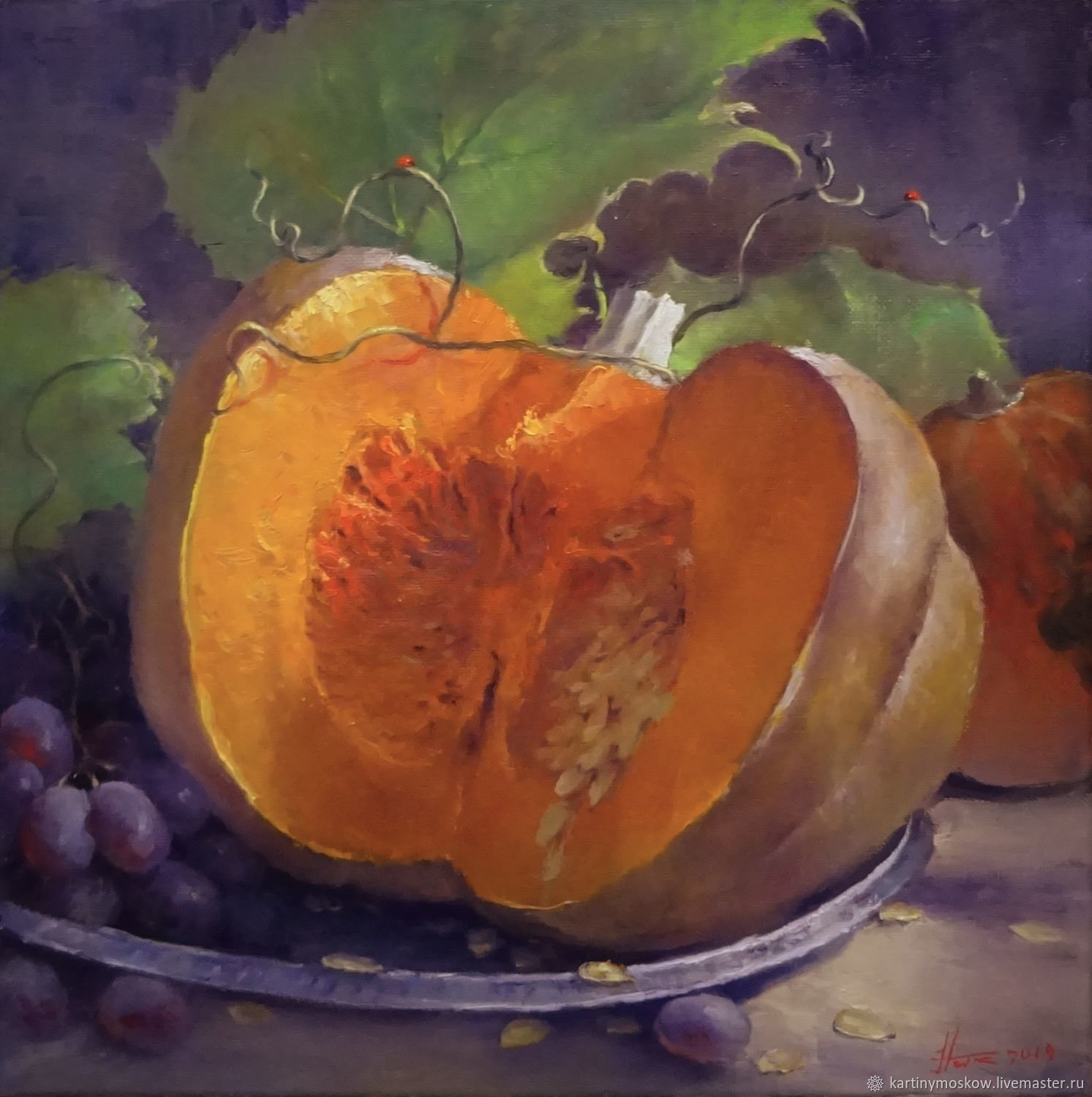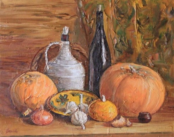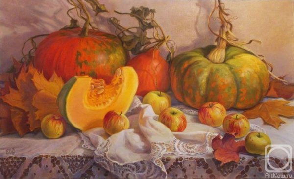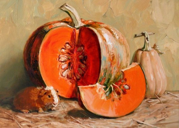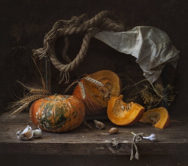 Картина "Натюрморт с тыквой" - это произведение искусства, которое захватывает взгляд своей простотой и одновременно удивительной красотой. В центре композиции расположена огромная тыква, которая притягивает внимание своей яркостью и насыщенностью цвета. Ее округлая форма и рельефная поверхность создают ощущение объемности и реалистичности. Изящно расположенные рядом фрукты и другие предметы придают картине гармоничность и баланс. Чудесная игра света и тени добавляет глубину и объемности изображению, делая его почти трехмерным. Картина "Натюрморт с тыквой" вызывает чувство природного богатства и обещает нам умиротворение и уют в нашем доме.