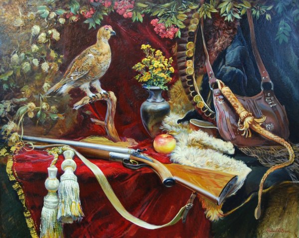 "Охотничий натюрморт" – картина, которая олицетворяет в себе силу природы и мужественность охотников. В этой работе художник передает атмосферу леса, демонстрируя умиротворенность и гармонию окружающей природы. Натюрморт состоит из различных элементов, таких как охотничье ружье, трофеи, птицы и ягоды, создавая впечатление полной жизни в окружении дикой природы. Эта картина позволяет зрителю насладиться красотой леса и проникнуться атмосферой охотничьего настроения. "Охотничий натюрморт" станет отличным украшением интерьера для тех, кто ценит природу и стремится ощутить ее энергию и величие.