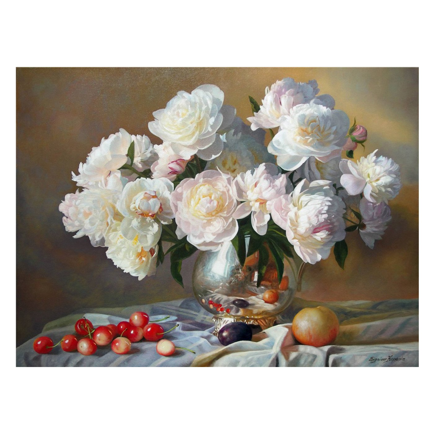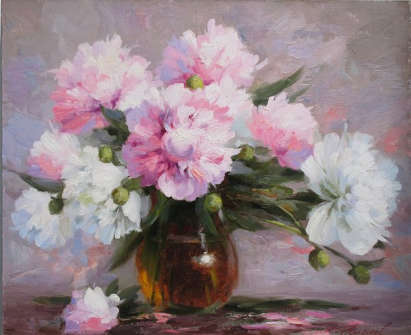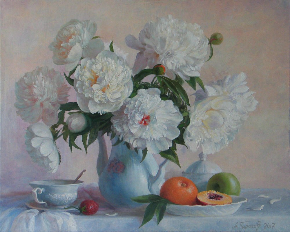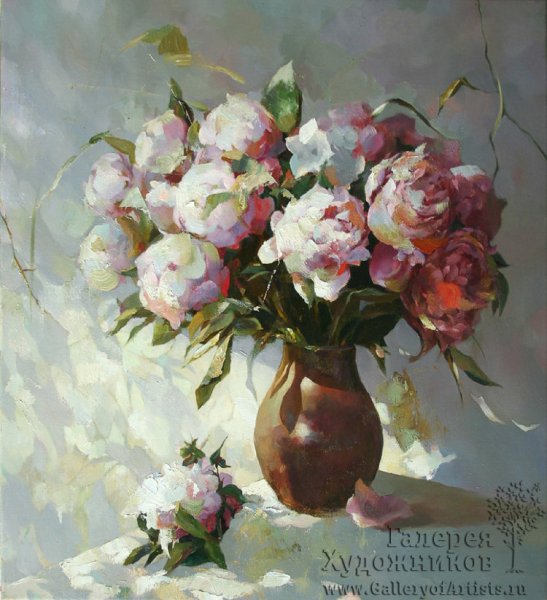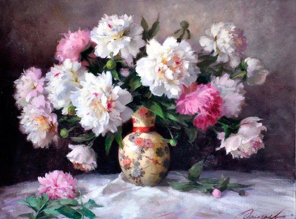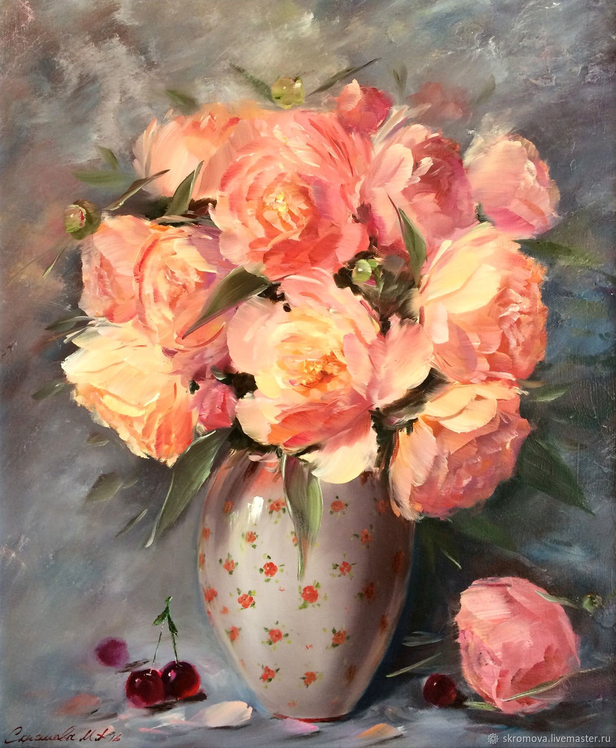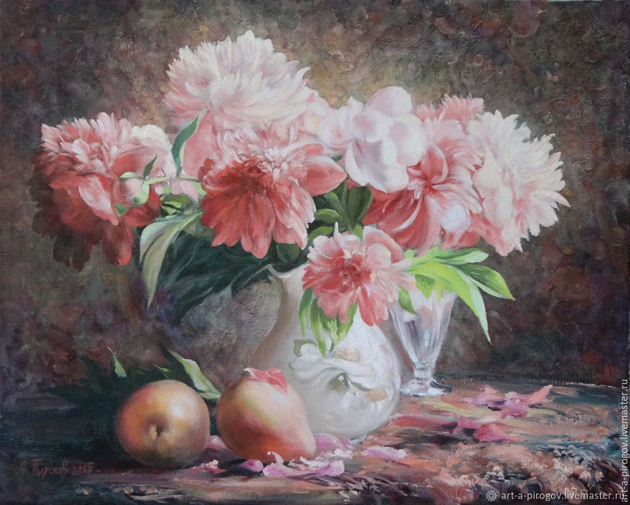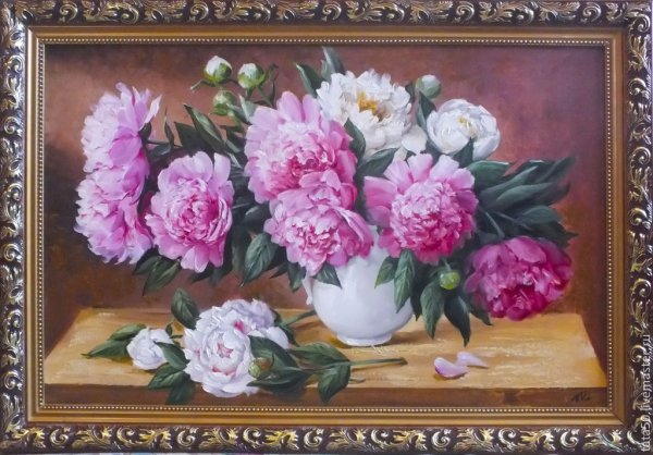 Картина маслом "Натюрморт с пионами" - это произведение искусства, которое восхищает своей нежной красотой и изысканностью. На полотне изображены прекрасные пионы, распускающиеся во всей своей великолепной пышности. Они будто оживают на фоне темного фона и наполняют комнату ароматом свежести и цветочного очарования. Художник смог передать каждый мягкий лепесток, каждый изящный контур цветка, создавая иллюзию реальности и заставляя зрителя прикоснуться к этой красоте. Эта картина станет украшением любого интерьера и подарит радость и восторг своим неповторимым образом.