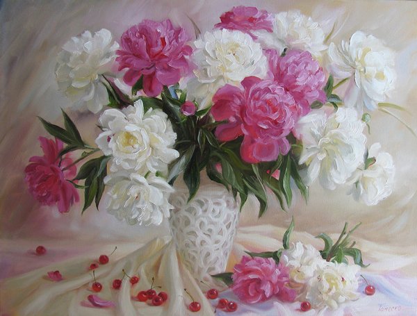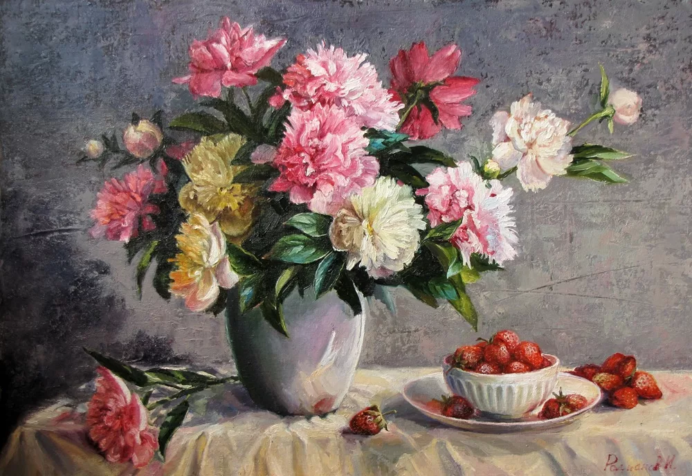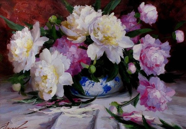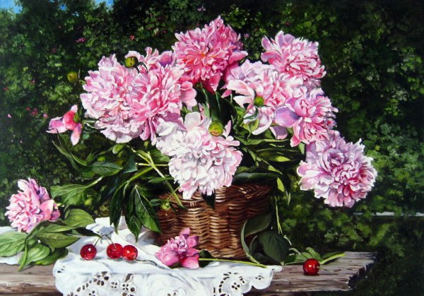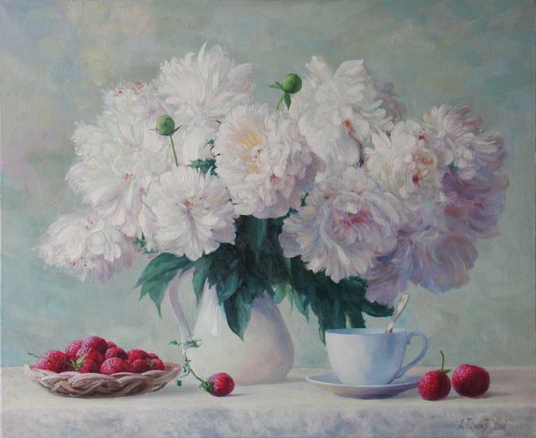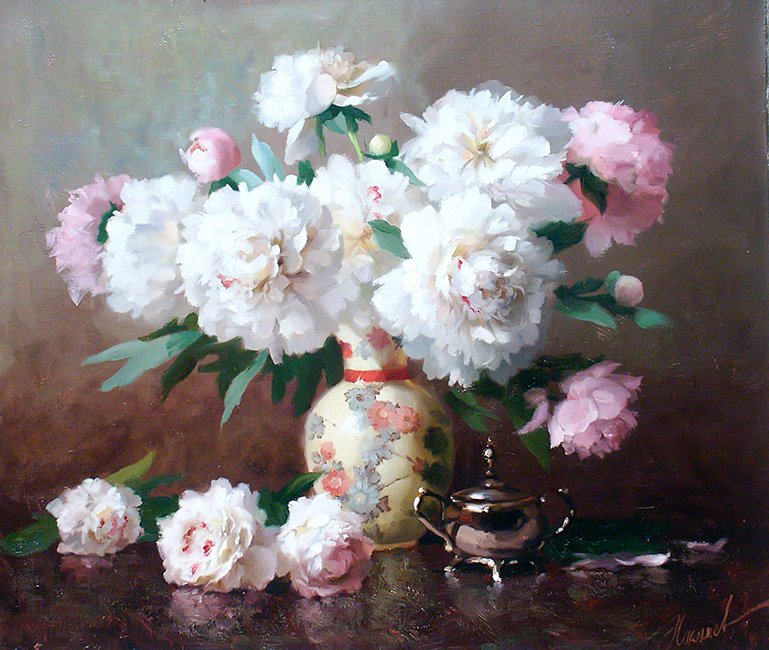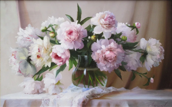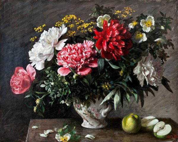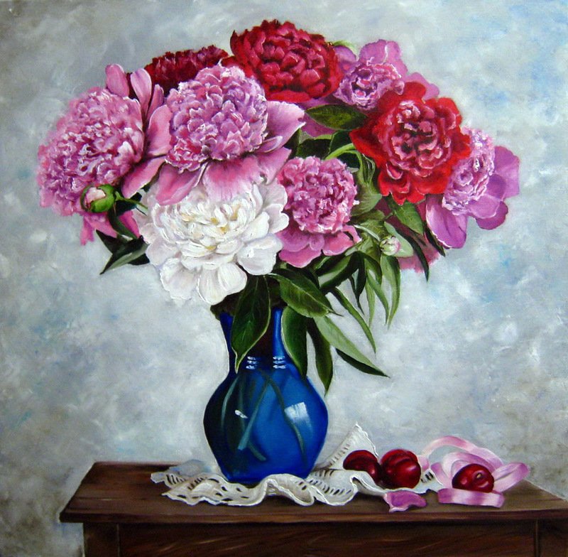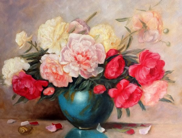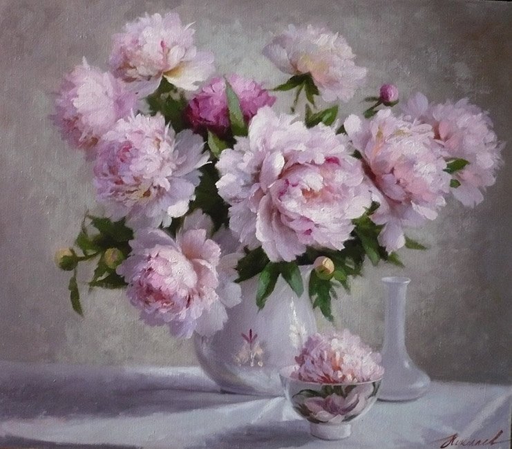 Картина маслом "Натюрморт с пионами" - это произведение искусства, которое восхищает своей нежной красотой и изысканностью. На полотне изображены прекрасные пионы, распускающиеся во всей своей великолепной пышности. Они будто оживают на фоне темного фона и наполняют комнату ароматом свежести и цветочного очарования. Художник смог передать каждый мягкий лепесток, каждый изящный контур цветка, создавая иллюзию реальности и заставляя зрителя прикоснуться к этой красоте. Эта картина станет украшением любого интерьера и подарит радость и восторг своим неповторимым образом.