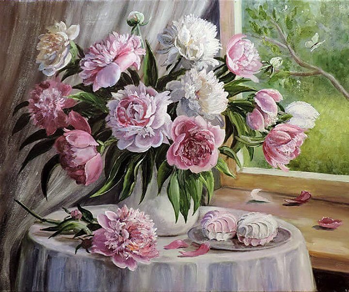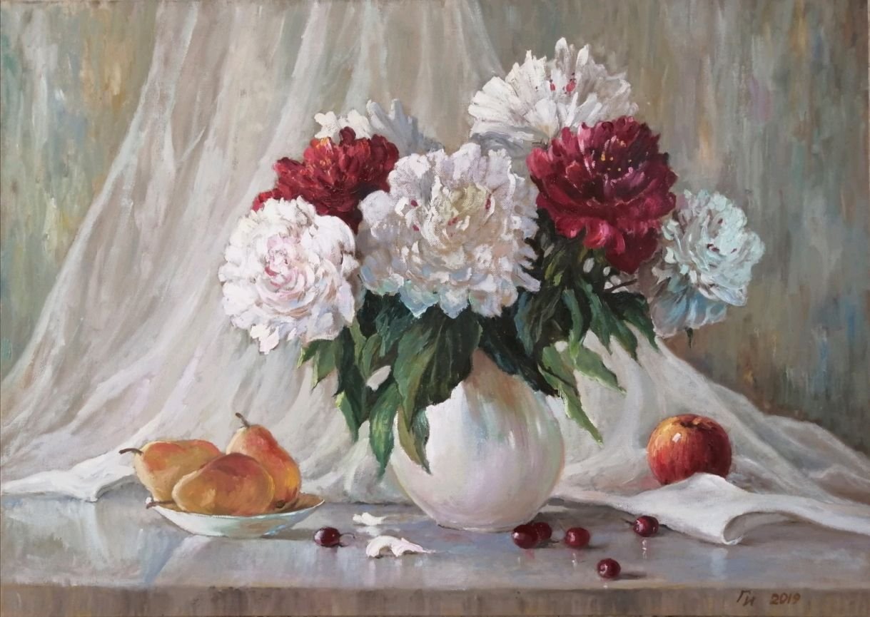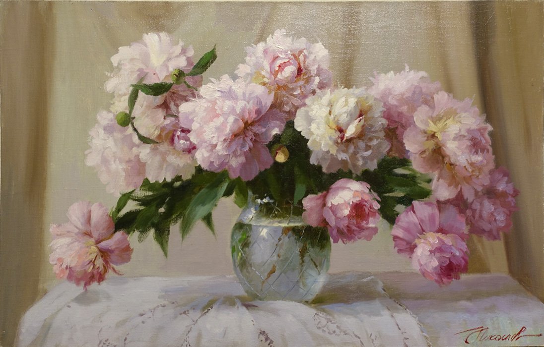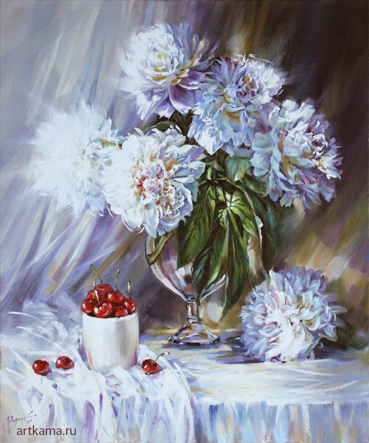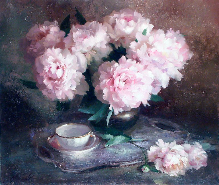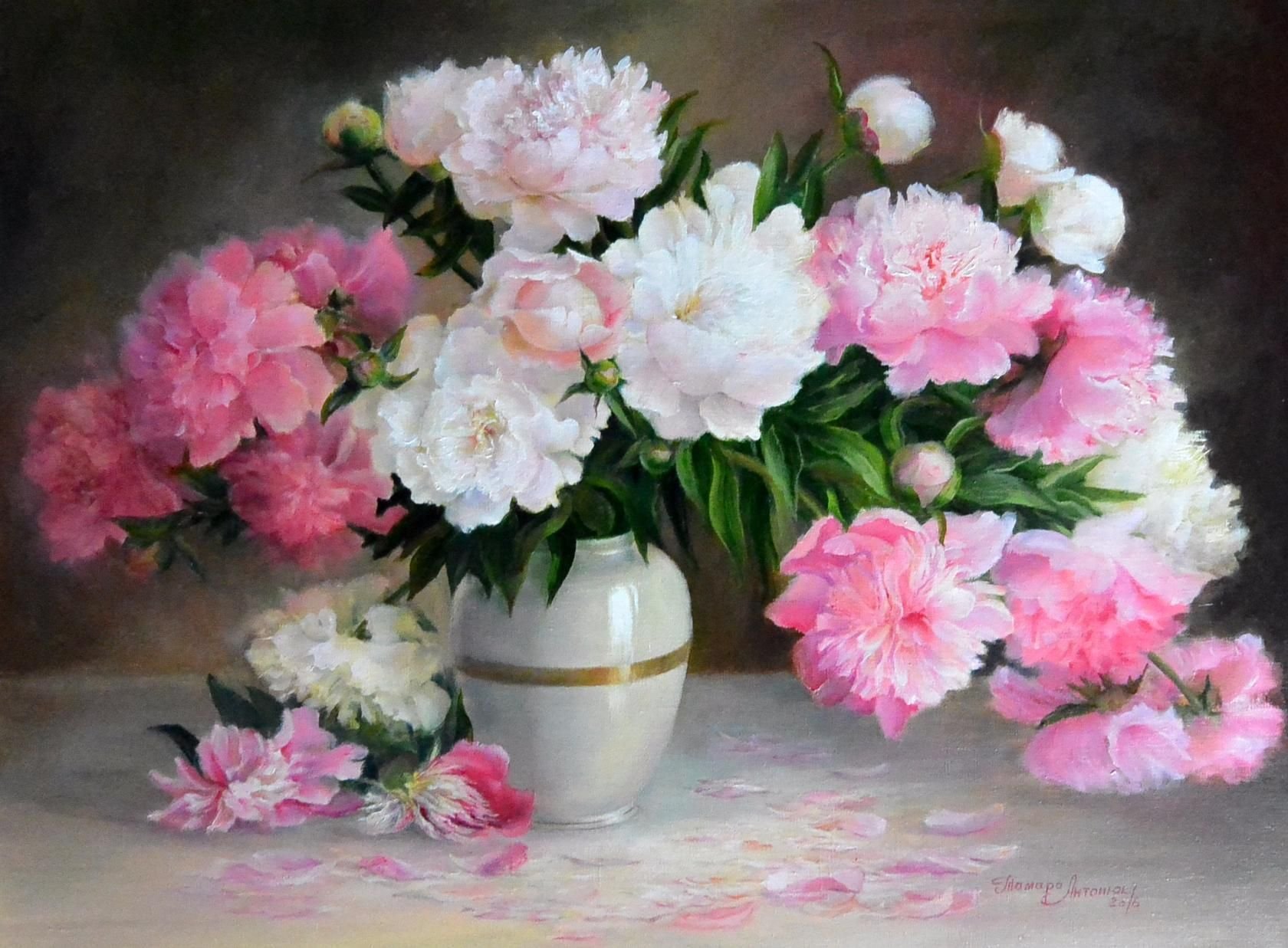 Картина маслом "Натюрморт с пионами" - это произведение искусства, которое восхищает своей нежной красотой и изысканностью. На полотне изображены прекрасные пионы, распускающиеся во всей своей великолепной пышности. Они будто оживают на фоне темного фона и наполняют комнату ароматом свежести и цветочного очарования. Художник смог передать каждый мягкий лепесток, каждый изящный контур цветка, создавая иллюзию реальности и заставляя зрителя прикоснуться к этой красоте. Эта картина станет украшением любого интерьера и подарит радость и восторг своим неповторимым образом.