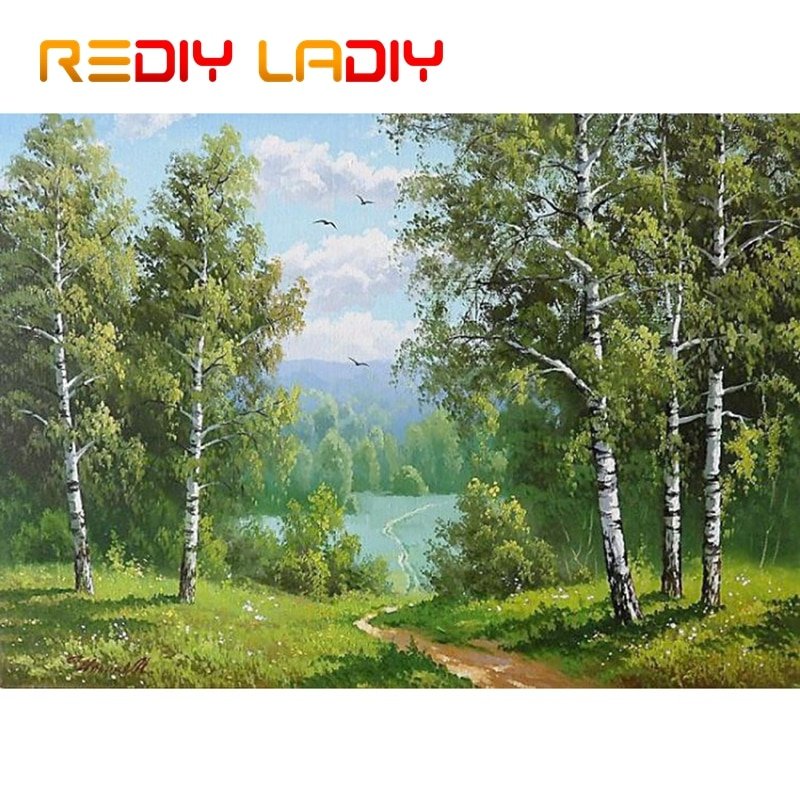 Алмазная живопись березы у озера