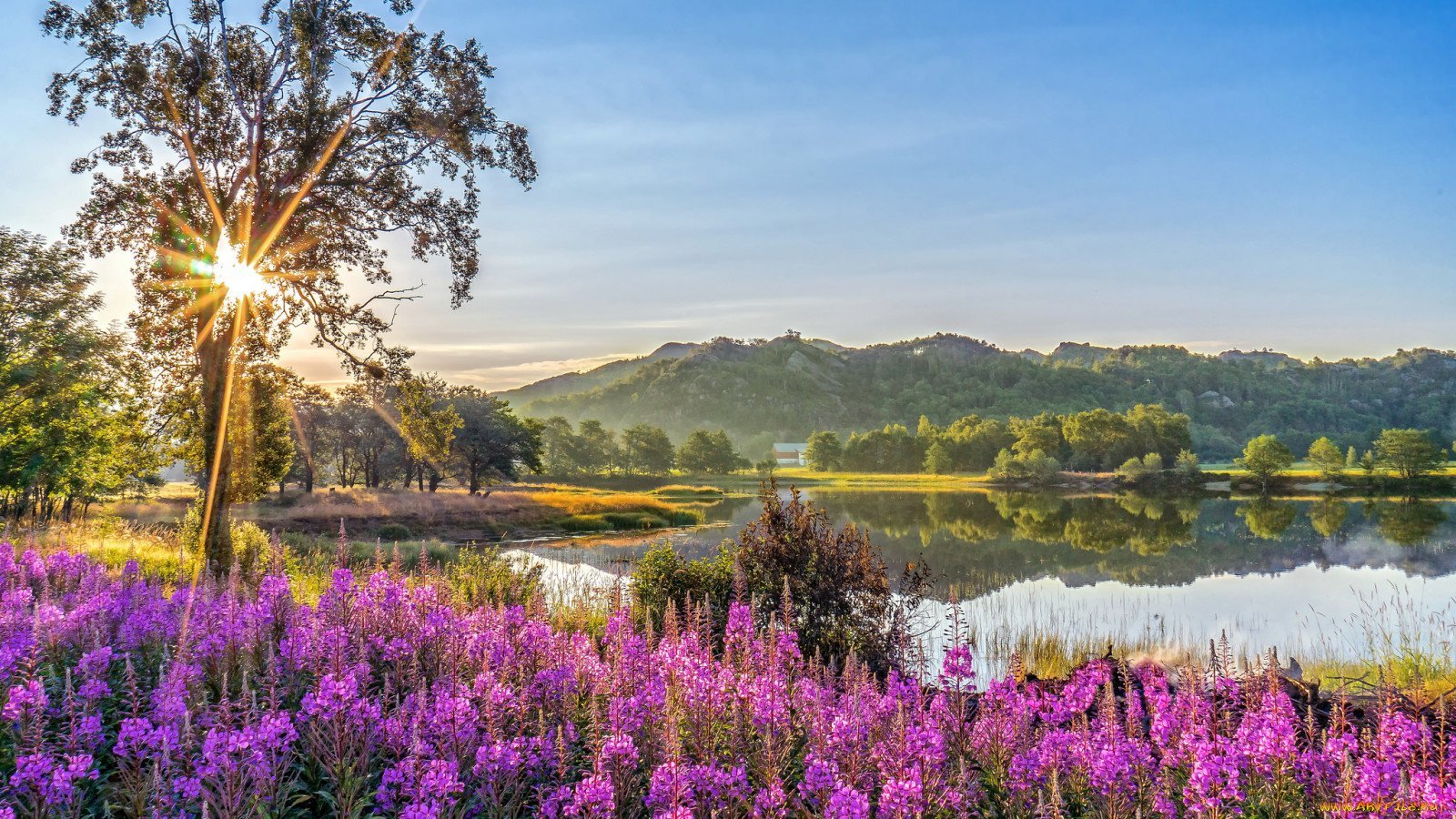 Пейзаж лес, дом, река, солнце