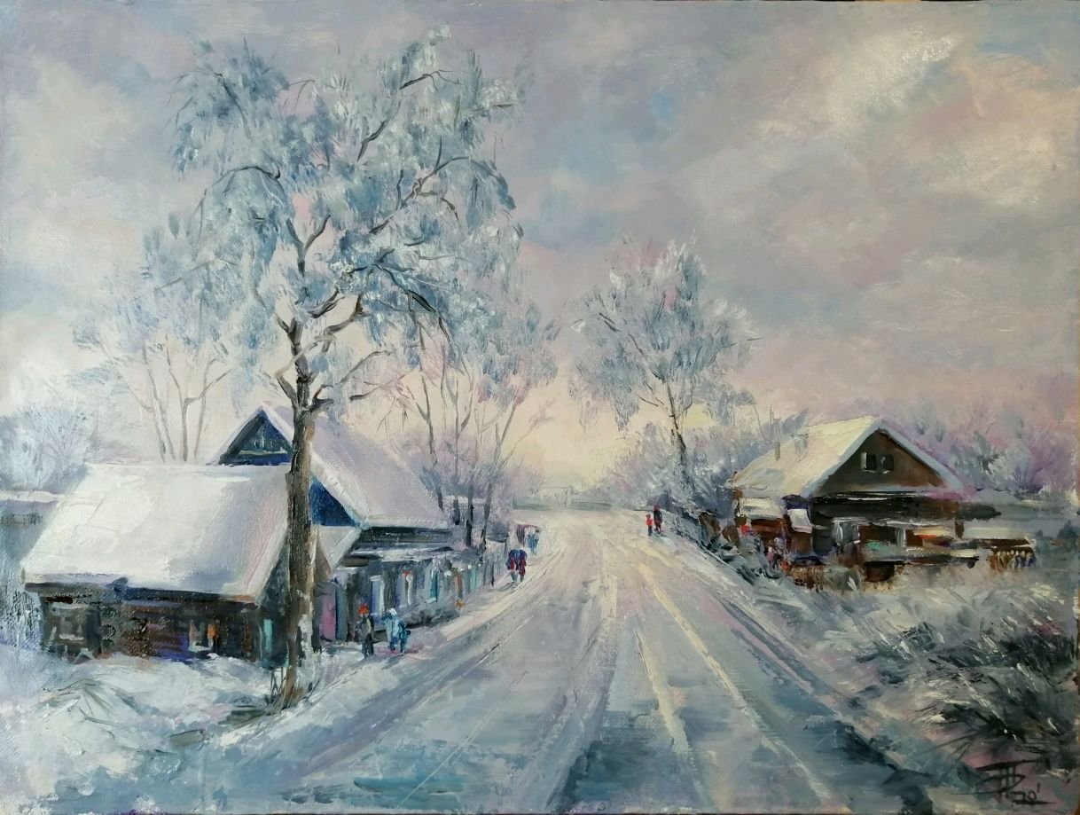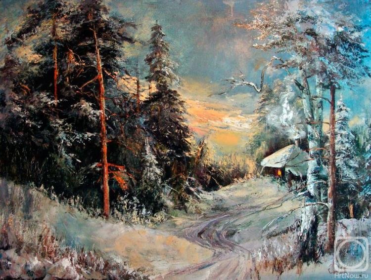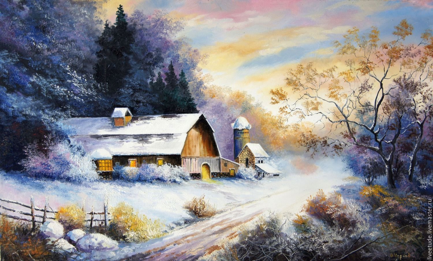 Зимний пейзаж, запечатленный маслом на холсте, захватывает взгляд своей красотой и атмосферой. Художник передал все оттенки зимы: белоснежные поля, покрытые свежим снегом, деревья, облитые серебристыми сиянием луны, и ярко освещенное небо, украшенное созвездиями. Картина словно оживает, создавая чувство холода и тишины. Проникновенная игра света и тени подчеркивает глубину и объемность композиции, придавая ей реалистичность и эмоциональное заряд. Это произведение искусства переносит зрителя в зимнюю сказку, где можно увидеть величие и неповторимость природы во всей ее красе.