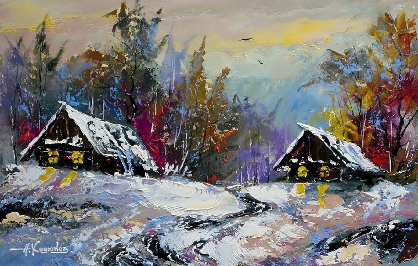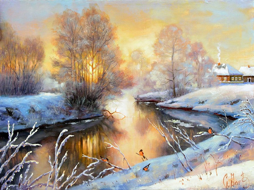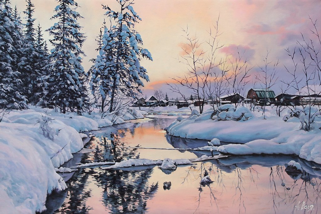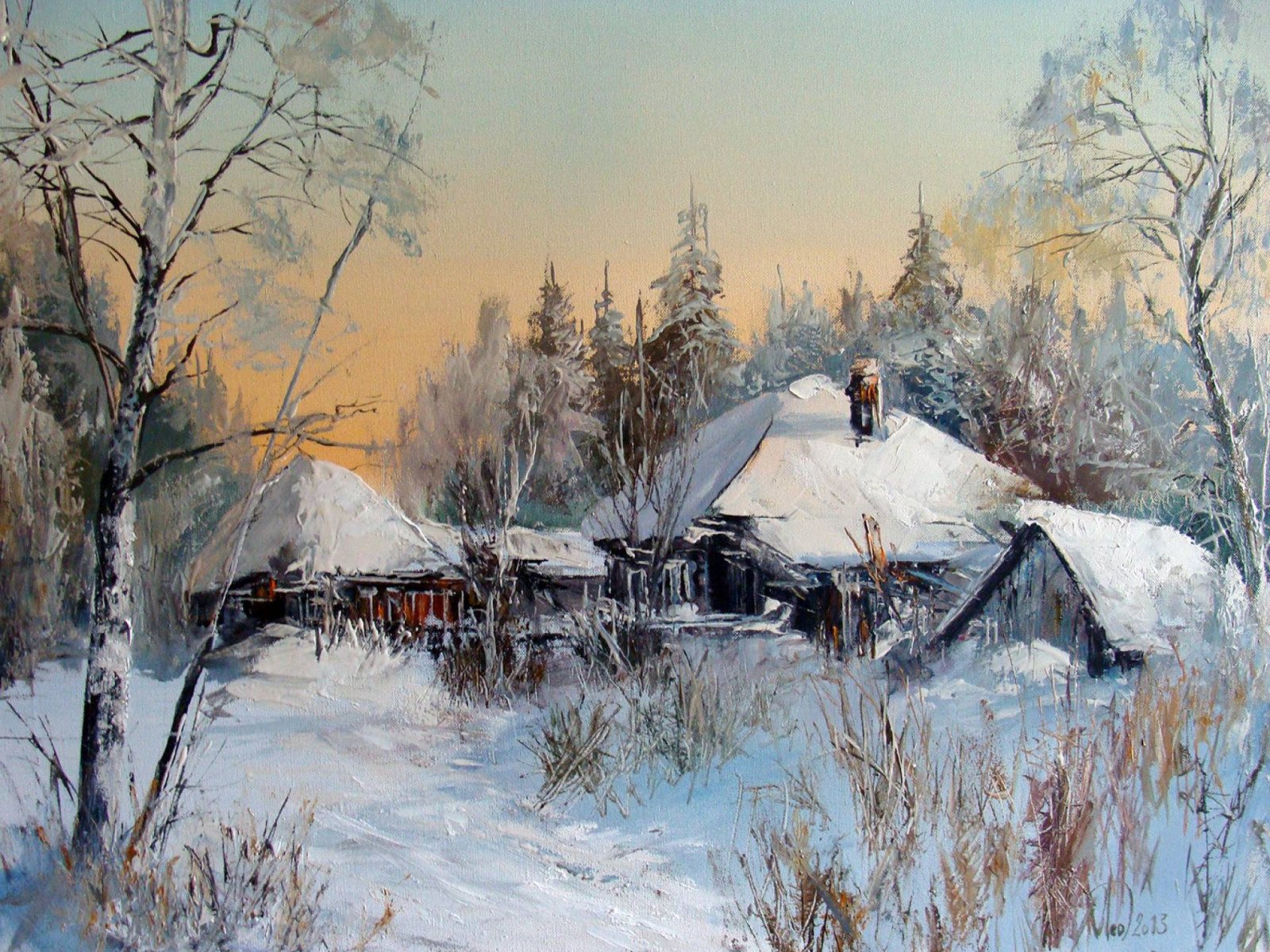 Зимний пейзаж, запечатленный маслом на холсте, захватывает взгляд своей красотой и атмосферой. Художник передал все оттенки зимы: белоснежные поля, покрытые свежим снегом, деревья, облитые серебристыми сиянием луны, и ярко освещенное небо, украшенное созвездиями. Картина словно оживает, создавая чувство холода и тишины. Проникновенная игра света и тени подчеркивает глубину и объемность композиции, придавая ей реалистичность и эмоциональное заряд. Это произведение искусства переносит зрителя в зимнюю сказку, где можно увидеть величие и неповторимость природы во всей ее красе.