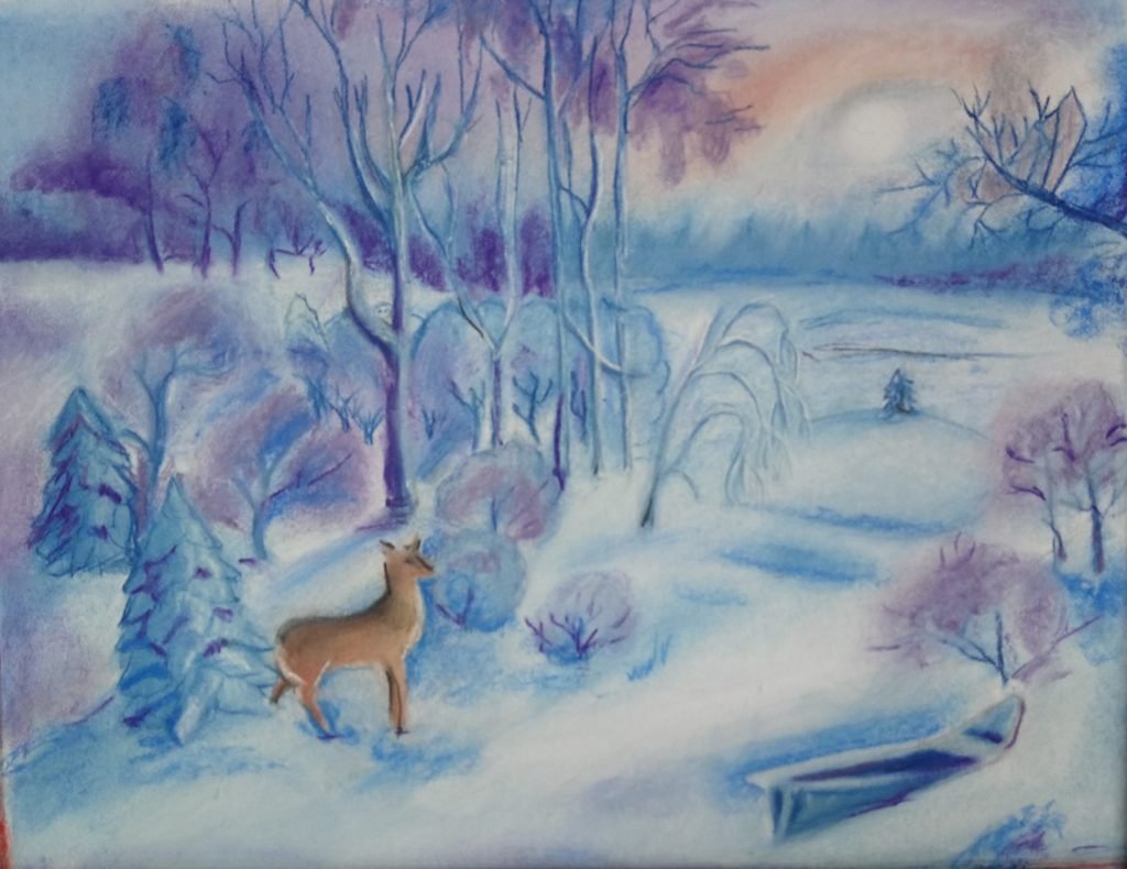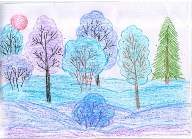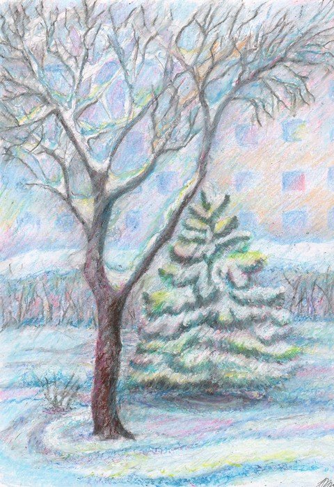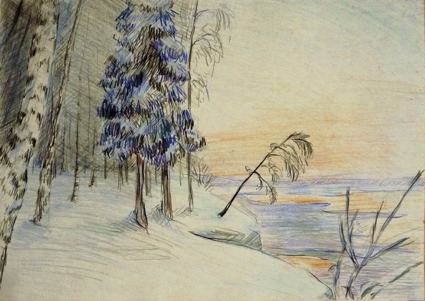 Зимний пейзаж, запечатленный цветными карандашами, открывает перед нами удивительное зрелище. Ледяной ветер мягко обволакивает ёлки и кусты, покрывая их тонким слоем инея. Белоснежный снег скрипит под ногами, создавая ощущение абсолютной тишины и спокойствия. На фоне яркого зимнего неба расцветает пастельная палитра - от бледно-голубого до нежно-розового. Каждая деталь пейзажа прорисована с особым трепетом, словно художник вложил в каждый штрих свою любовь к зимней природе. Этот замечательный зимний пейзаж, ожившей под рукой талантливого художника, позволяет насладиться красотой и волшебством зимней природы прямо на страницах рисунка.