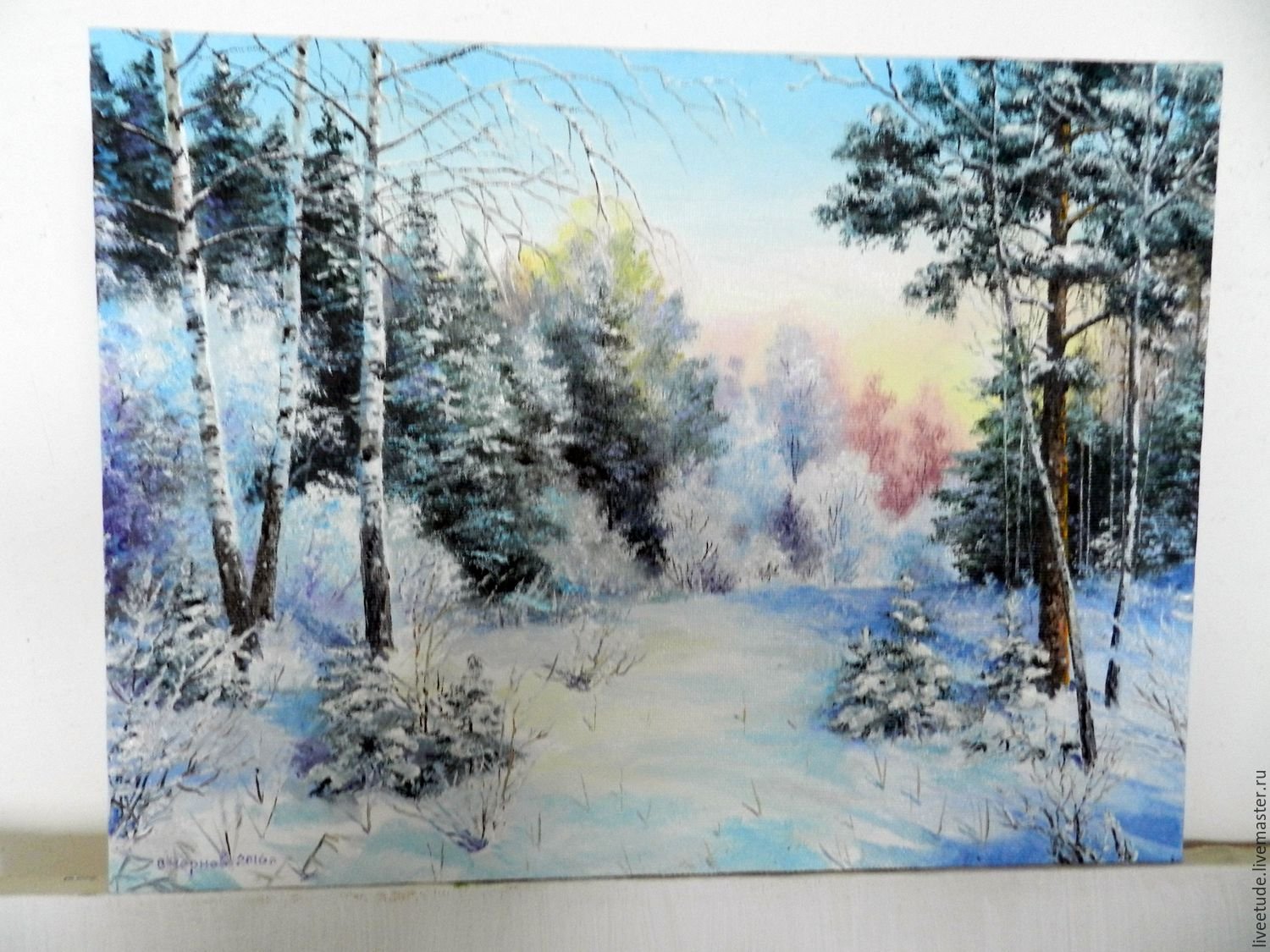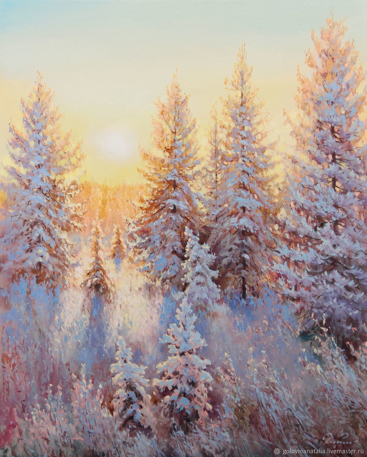 Зимний пейзаж, запечатленный на холсте масляными красками, переносит нас в удивительный мир зимней сказки. Картина оживает перед нами, словно мы оказываемся в среди снежных просторов и кристально чистого воздуха. Деревья, покрытые белым покрывалом, тихо склоняют ветви под тяжестью снега, создавая неповторимый рисунок. Холодные оттенки синего и серого гармонично соседствуют с яркими мазками желтого и оранжевого, заставляя нас ощутить игру света и тени, которая придает картине глубину и объем. В центре картины мы можем разглядеть небольшой домик, из окон которого светится уютное тепло. Зимний пейзаж, выполненный маслом, не только украшает интерьер, но и позволяет нам окунуться в атмосферу зимнего волшебства, наполнив наши сердца радостью и восторгом.