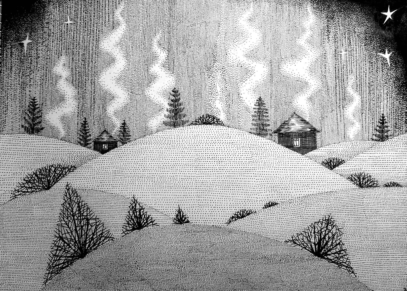 Зимний пейзаж гелевой ручкой