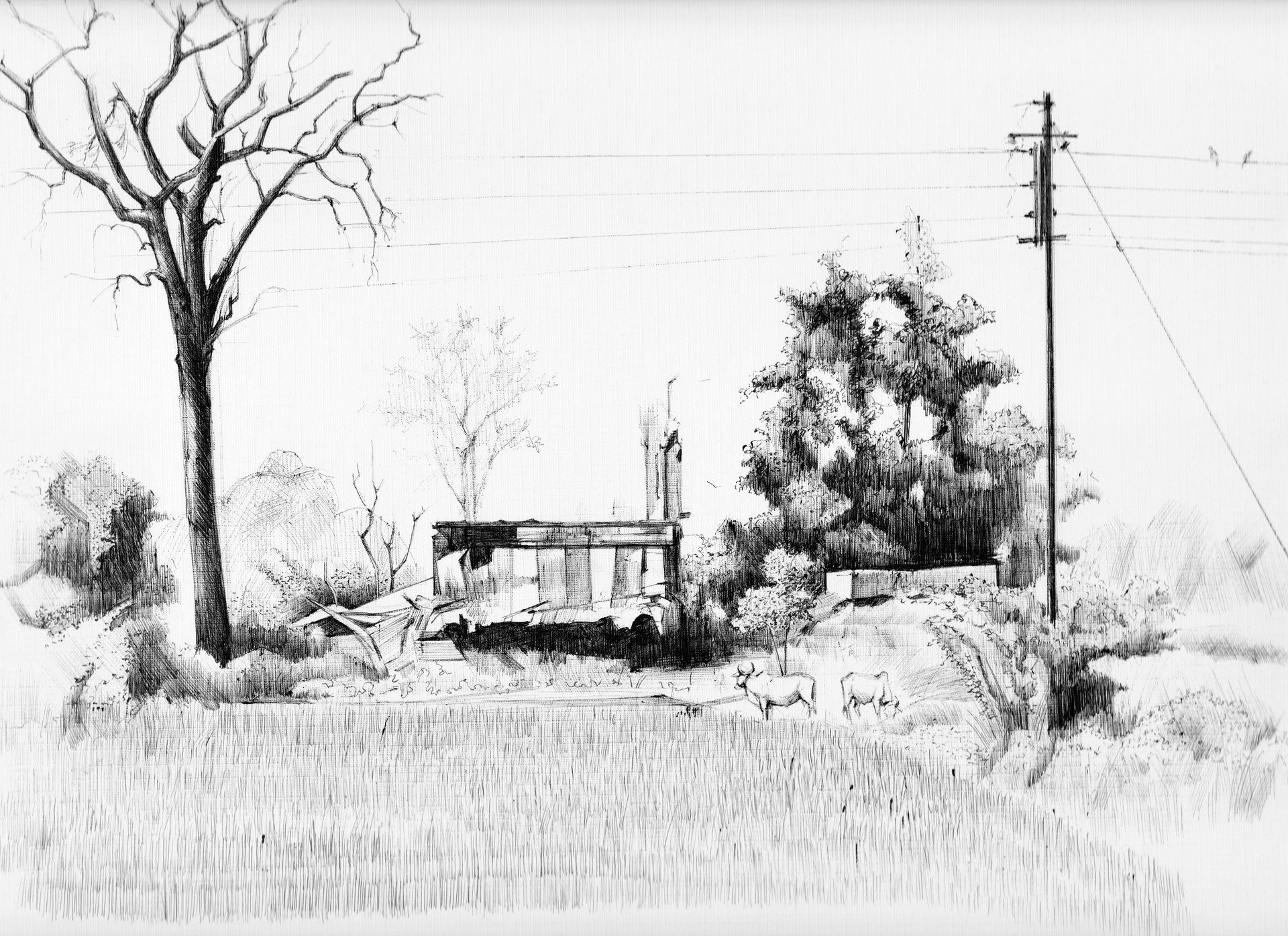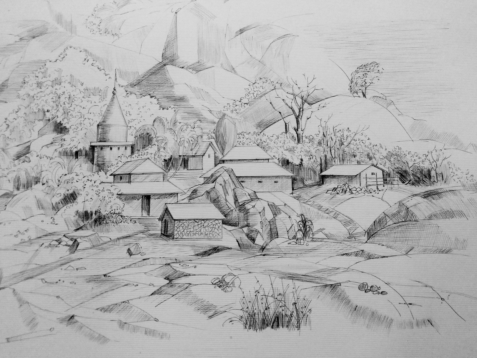 Деревенский пейзаж карандашом