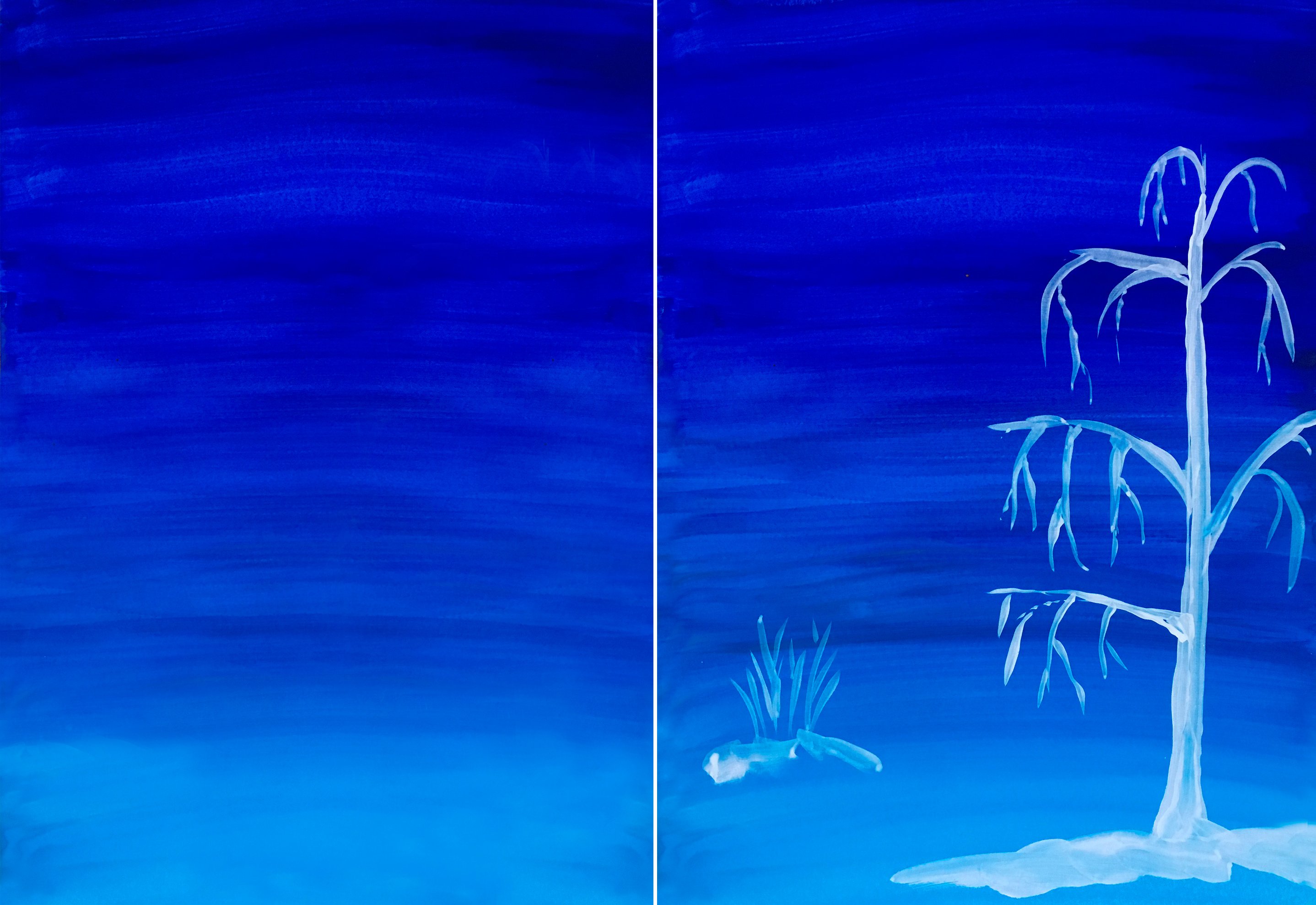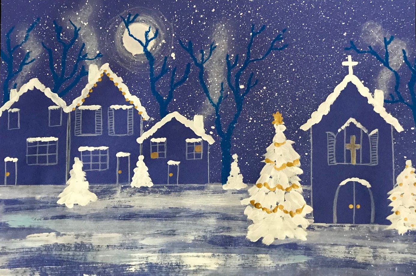 Зимний пейзаж белой гуашью на темном фоне