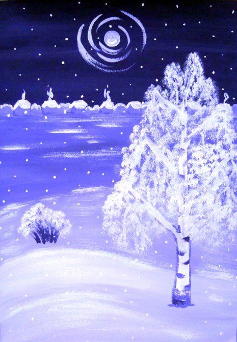 Ночной зимний пейзаж гуашью