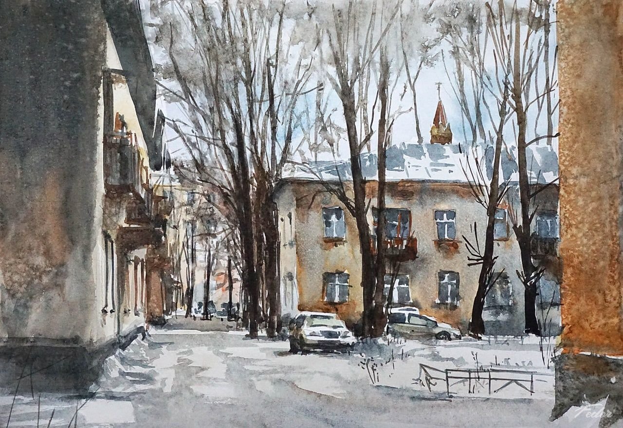 Зимний городской пейзаж акварелью