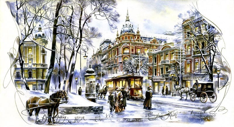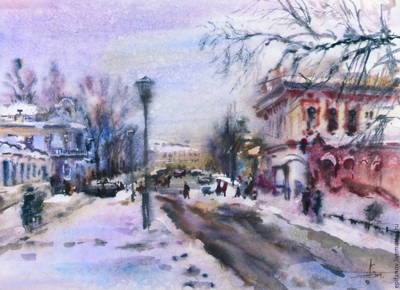 Зима в городе акварель
