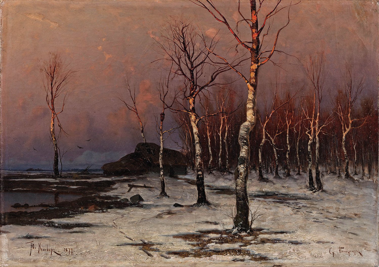 Ю. Клевер «зимний пейзаж с избушкой» 1899