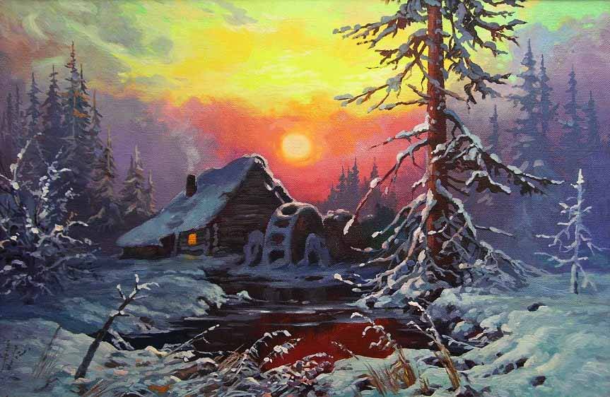 Юлий Юльевич Клевер зимний пейзаж с избушкой