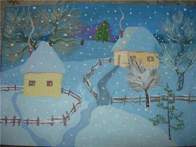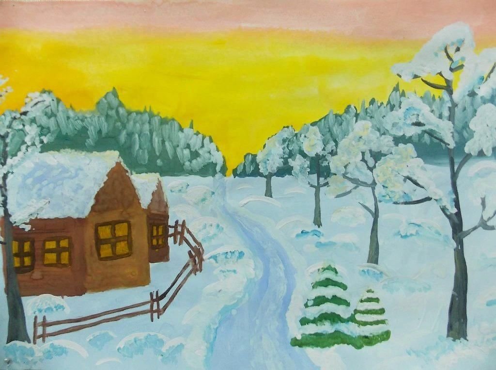Зимний пейзаж гуашью для детей