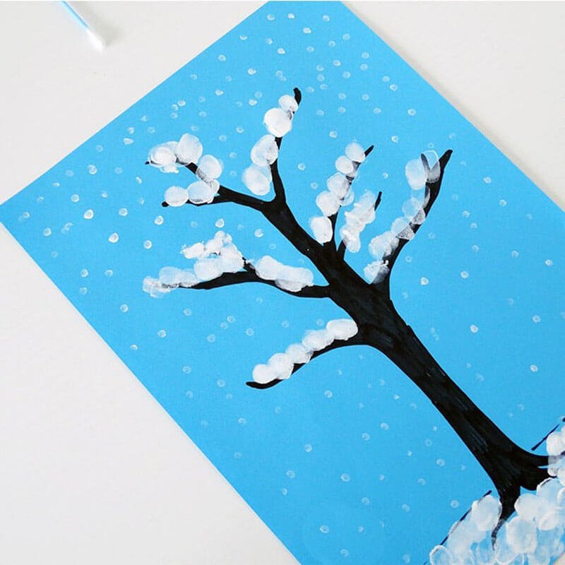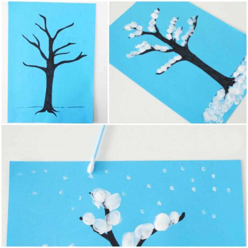 Дерево зимой ватными палочками