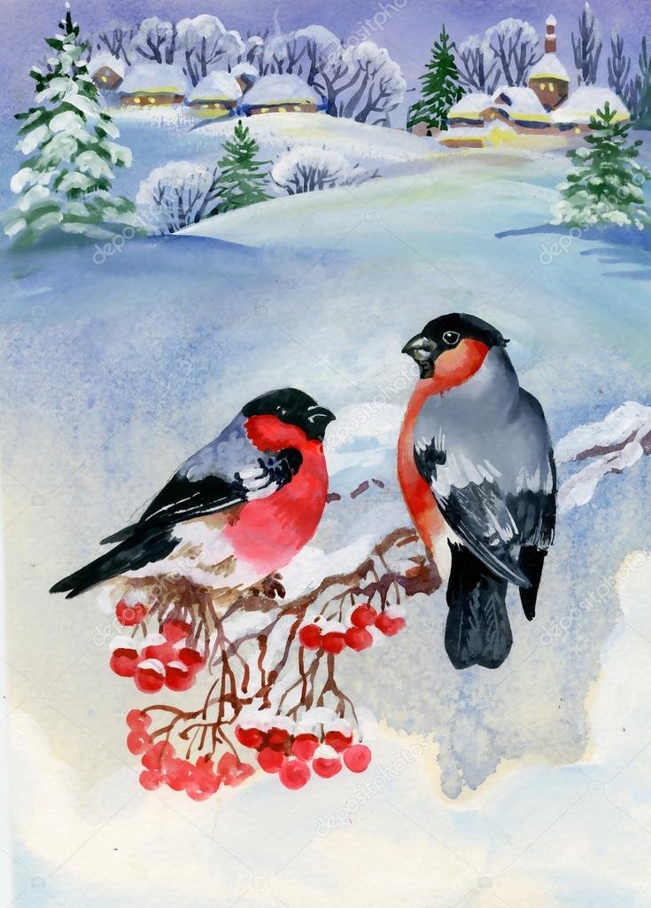Зимний пейзаж со снегирями