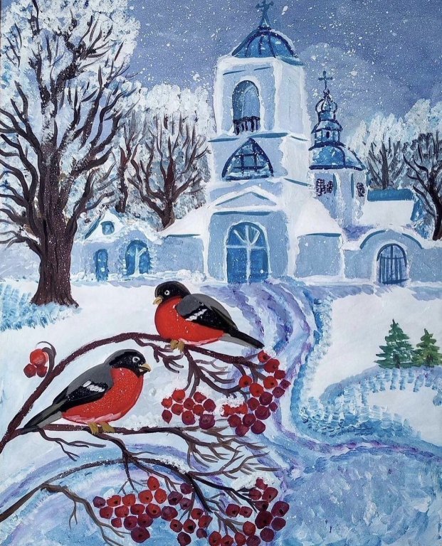 Живопись мастихином Снегири