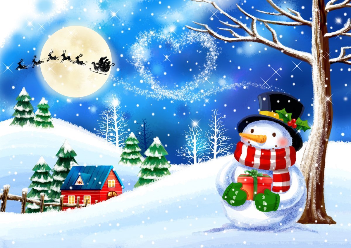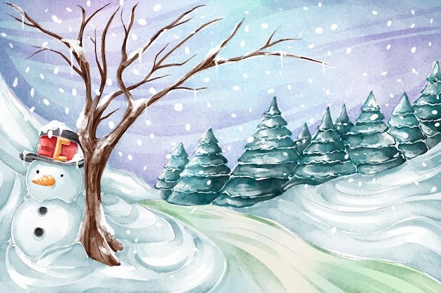 Зимний пейзаж со снеговиком для детей