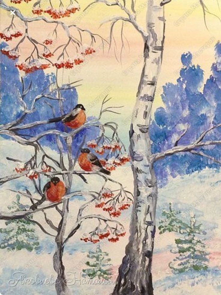 Зимний пейзаж гуашью и акварелью