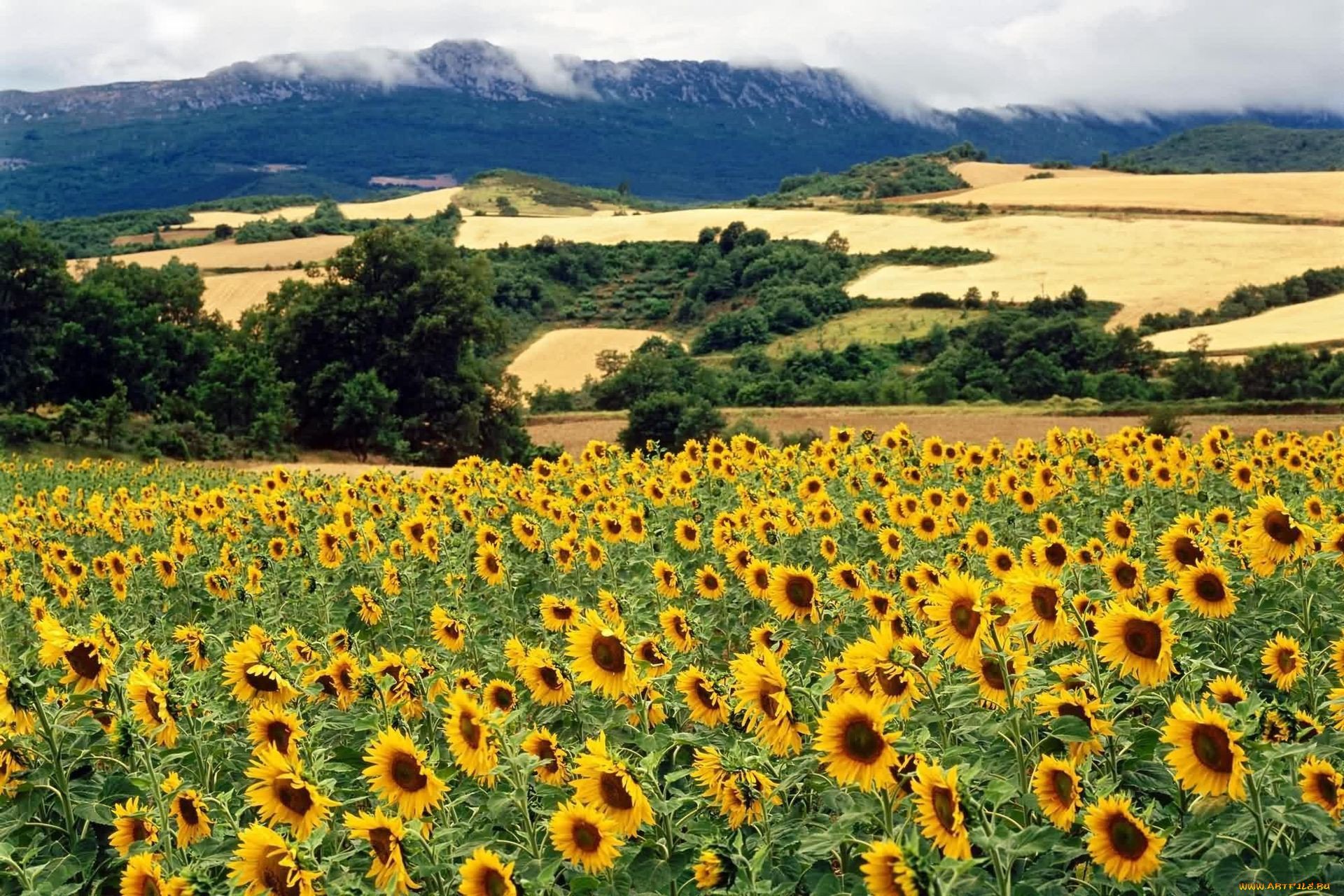 Кубань горы и поля с подсолнухами