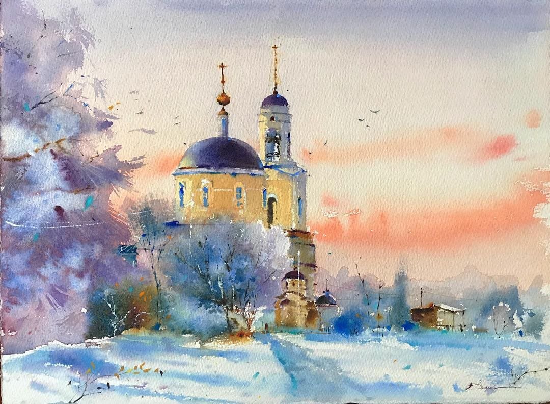 Трушникова пейзаж Церковь акварель