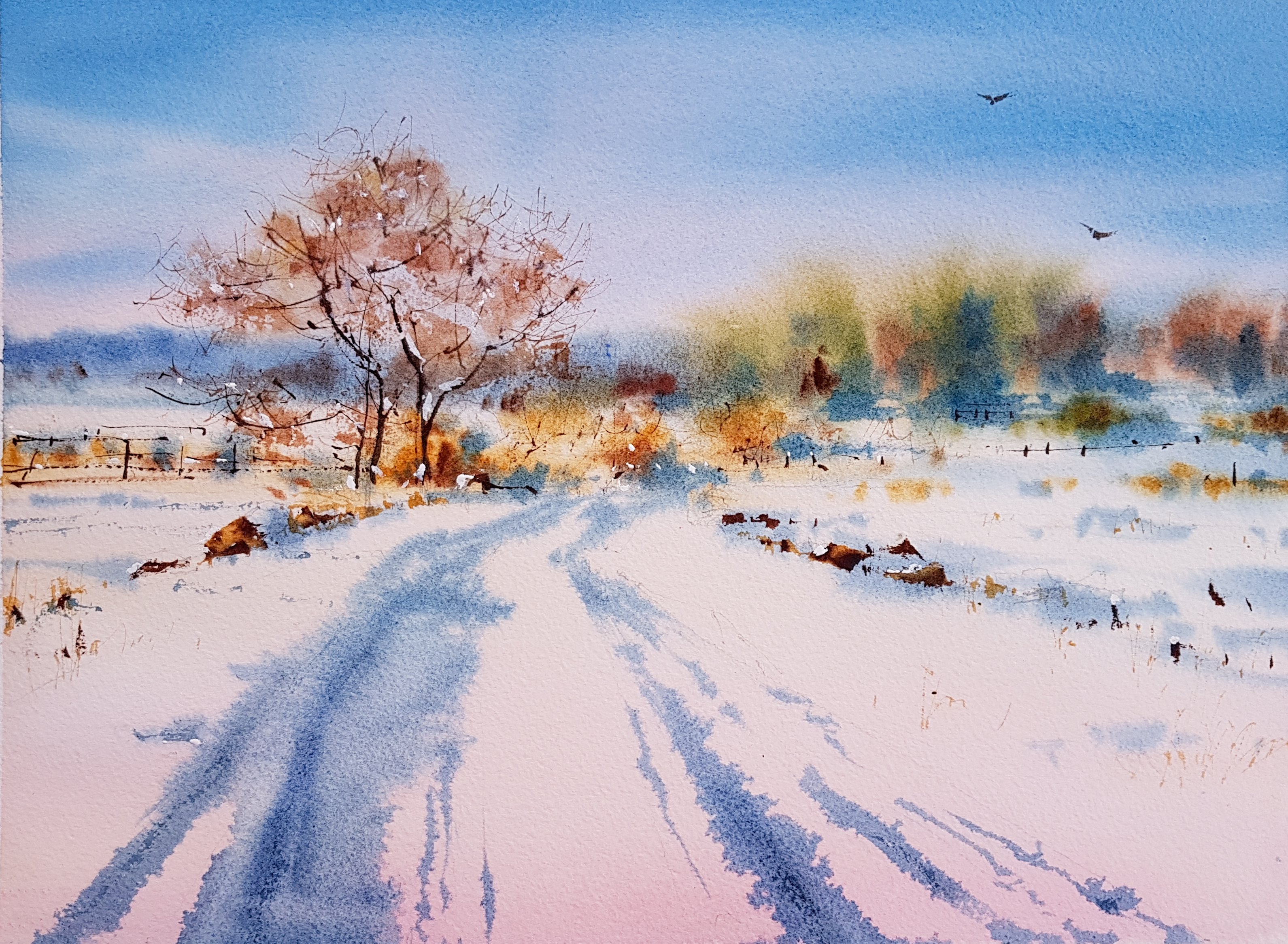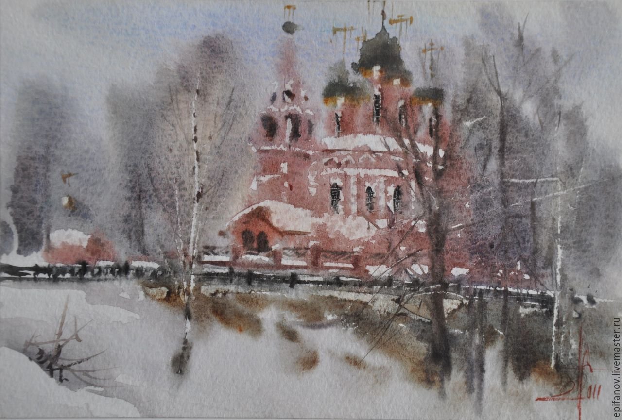 Зимний пейзаж акварель Павел Пугачев