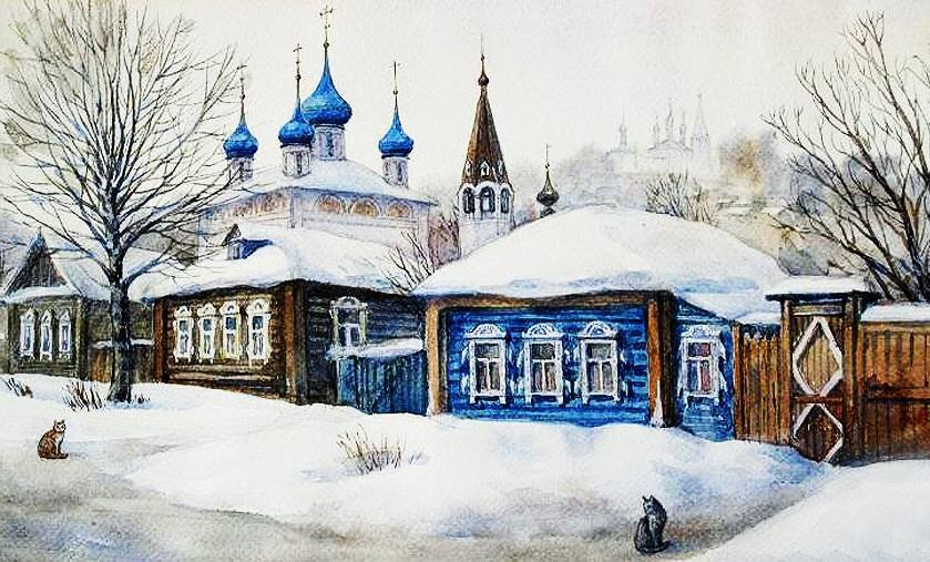 Церковь Абрамцево зима акварель