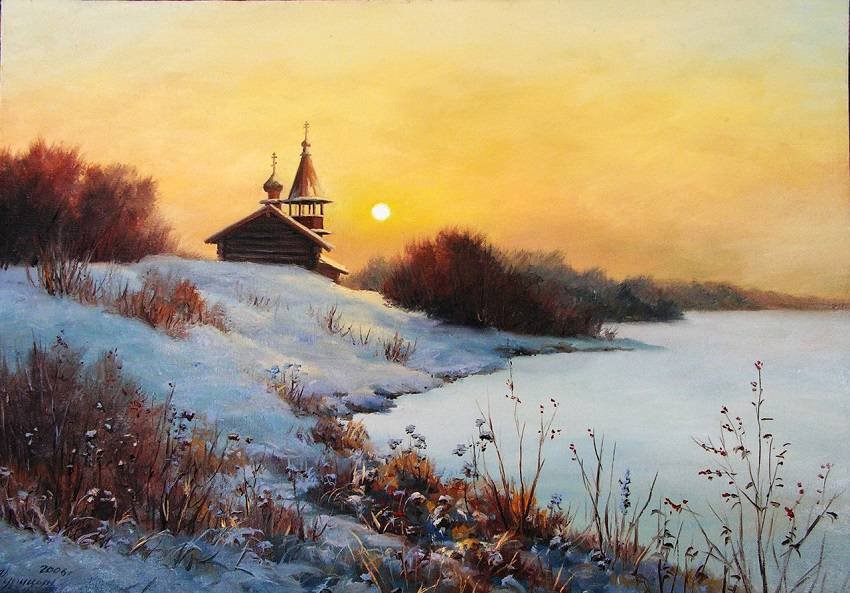 Зимний пейзаж с Церковью живопись